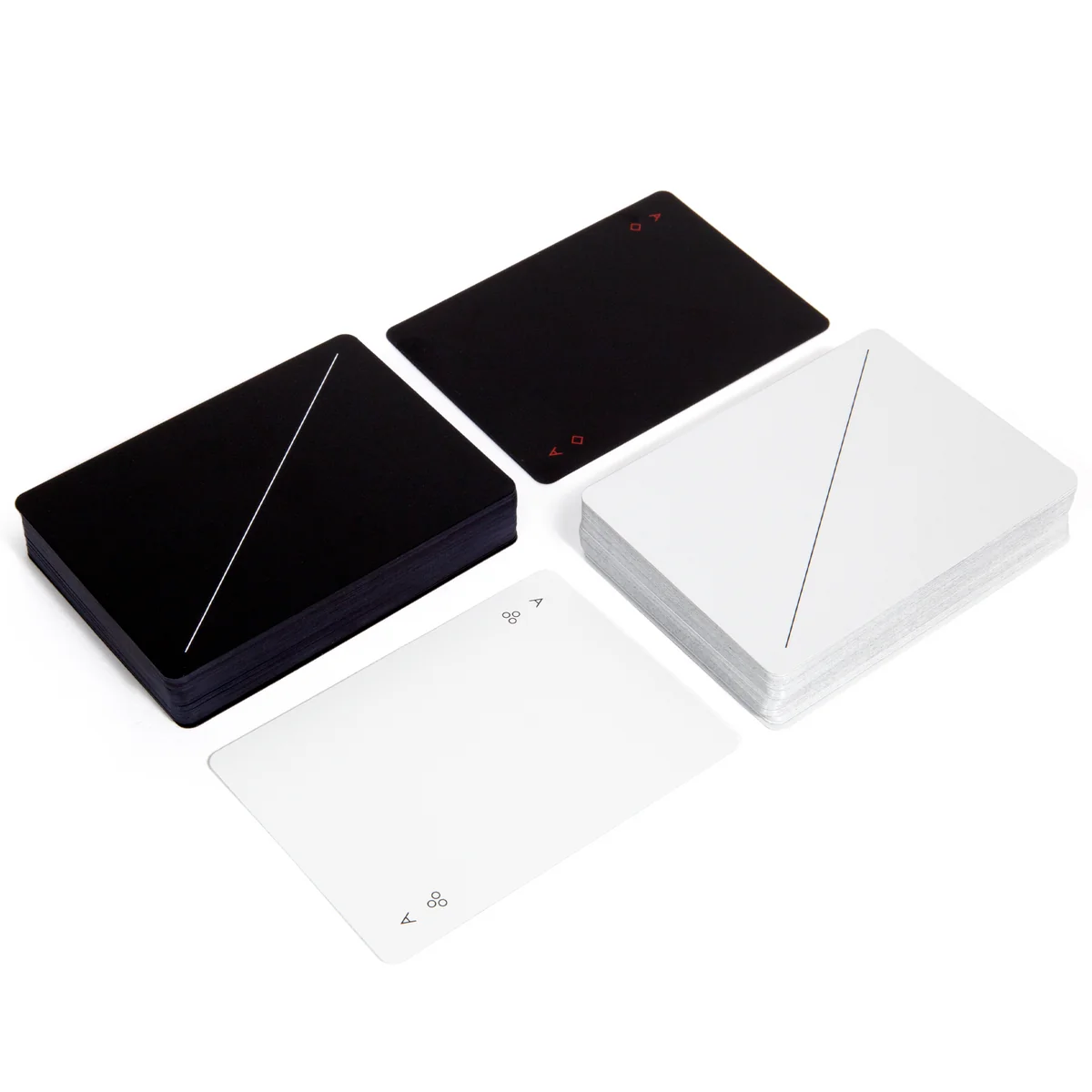 Les Minim cartes à jouer de la maison Areaware enthousiasment par leur design moderne et minimaliste tout en conservant le plaisir bien connu de jouer. Les symboles géométriques simples des cœurs, carreaux, trèfles et piques sont réduits au strict minimum. Il en va de même pour les dos, qui sont décorés d'une simple ligne diagonale. Les cartes sont fabriquées à partir d'un mélange de matériaux en papier et en PVC.