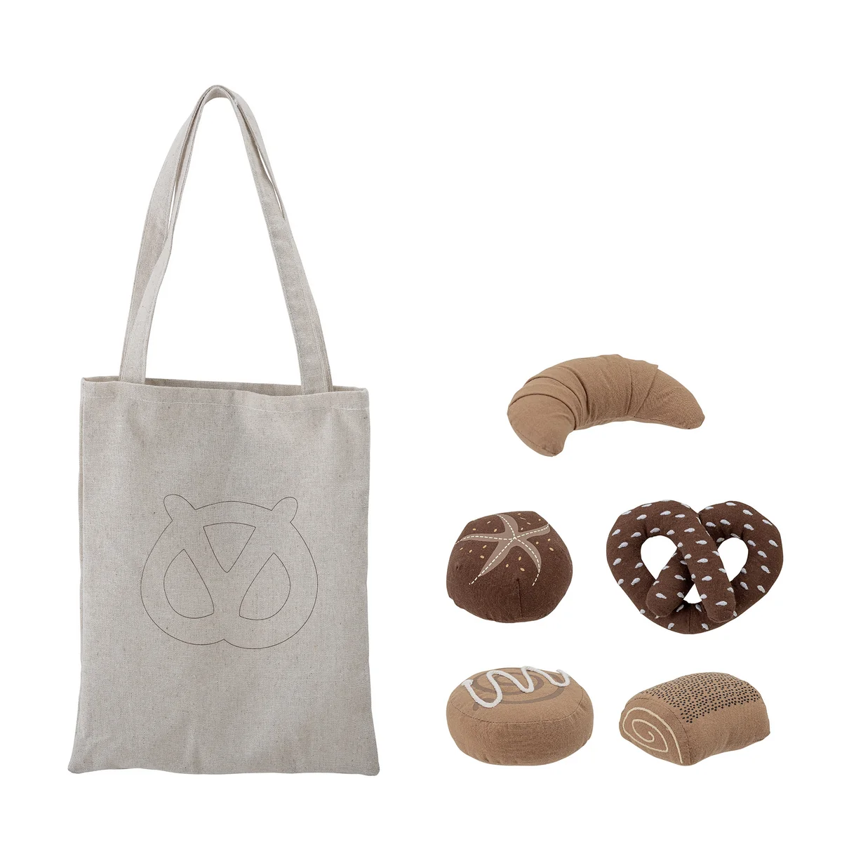 Le set de jeu Mini Snoore de Bloomingville est parfait pour mettre en scène de petites expériences de shopping ou de petit déjeuner. Le set de jeu contient 5 sortes de pain et un adorable sac de boulangerie. Ce jouet douillet est fabriqué en coton et remplit de joie chaque enfant.