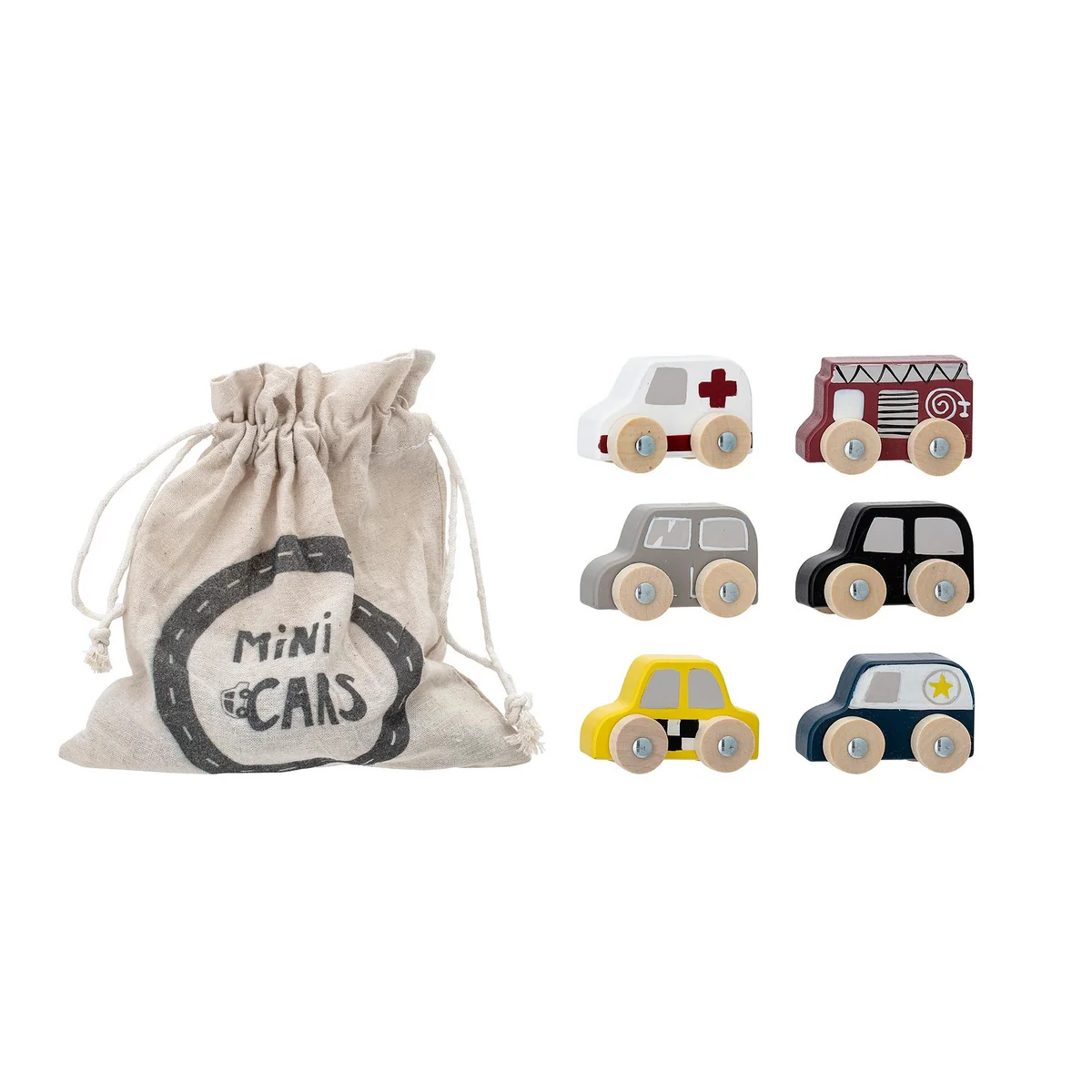 Avec les véhicules en bois de Bloomingville, vous pouvez vivre des aventures dans la chambre des enfants. L'ensemble se compose de six véhicules différents avec roues, dont un taxi, une voiture de police, une ambulance et un camion de pompiers. Avec les véhicules grands et petits s'amusent surtout beaucoup sur un tapis jouet avec des routes.
