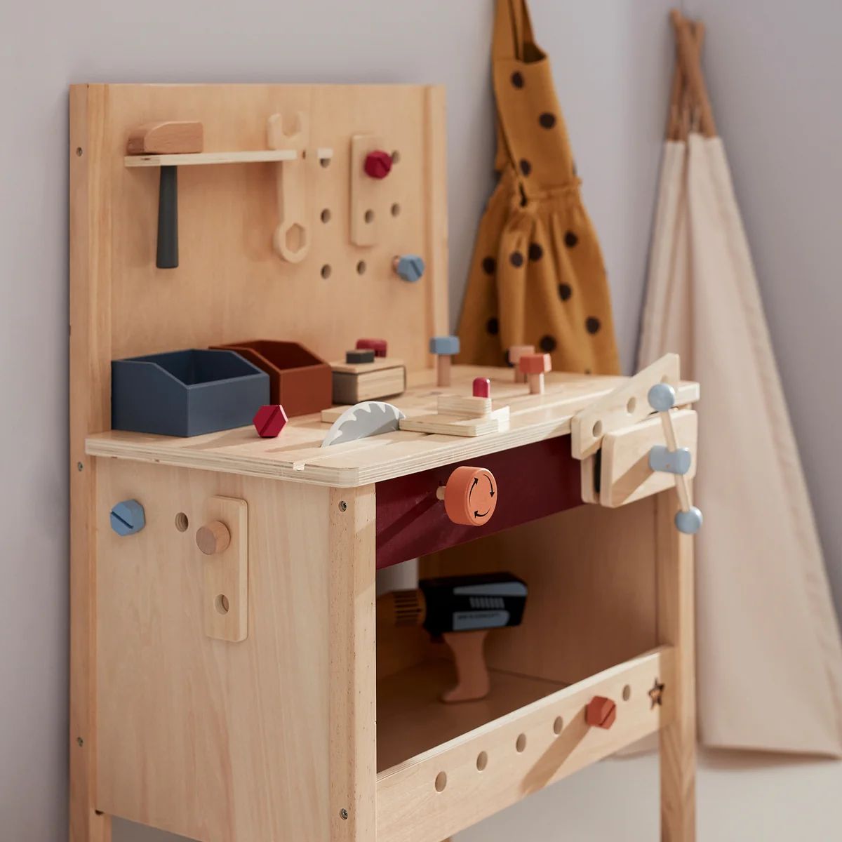 L'établi avec accessoires Kid's Hub de Kids Concept est parfait pour les jeunes passionnés qui aiment travailler le bois. Avec ce mini-établi, aucun projet n'est trop difficile pour le menuisier en herbe. L'établi dispose de trous stratégiquement placés pour y fixer des vis, des clous et des plaques de construction. Les illustrations sur le plateau de l'établi montrent où il faut visser et marteler pour améliorer l'expérience d'apprentissage.