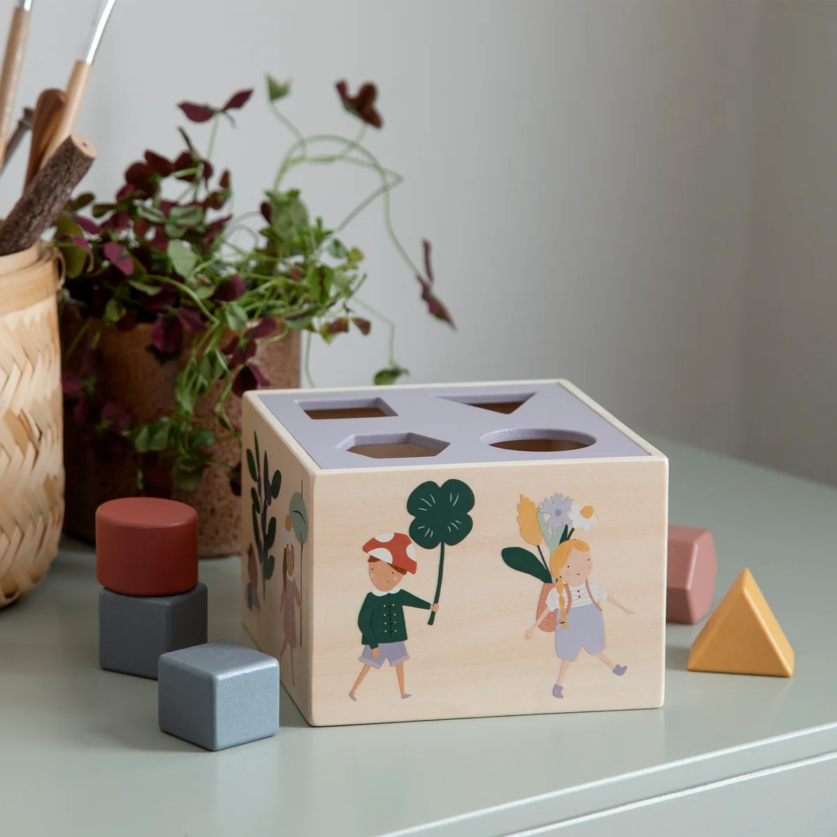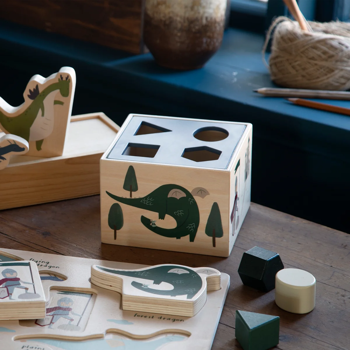 Le jeu d'encastrement de formes de Sebra se compose d'une boîte sur laquelle figurent d'adorables illustrations avec des motifs de différents univers thématiques. Le couvercle est percé de quatre trous de différentes formes géométriques. Les huit blocs de couleur unie sont fabriqués dans les mêmes formes et s'insèrent dans les trous de la boîte.