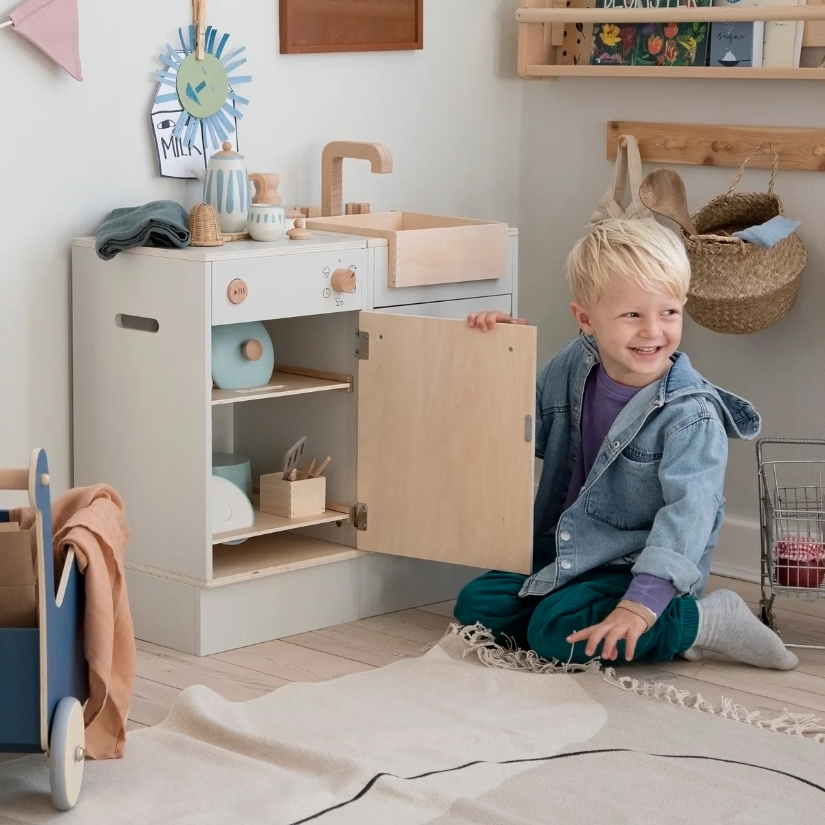 La cuisine KIDchen Cuisine pour enfants en bois de la maison danoise Sebra garantit un plaisir de jeu varié grâce à son design organique. Les enfants peuvent devenir des cuisiniers professionnels grâce aux différentes variantes en bois certifié FSC. Qu'ils soient utilisés seuls ou en combinaison, la cuisinière, le lave-vaisselle et l'évier complètent leur propre cuisine de jeu.