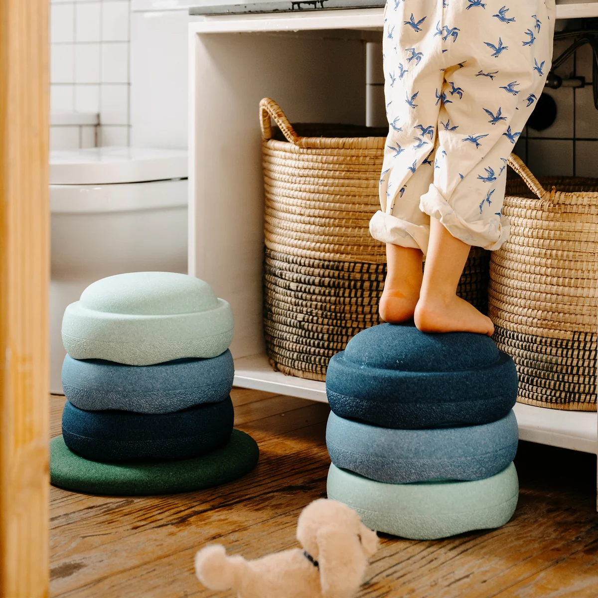 Le jeu Stapelstein® Waters & Greens Set convient parfaitement à une assise dynamique ou à des exercices d'équilibre actifs. La hauteur d'assise de la pierre colorée peut être adaptée individuellement. Lorsque les pierres sont empilées les unes sur les autres, le niveau de difficulté augmente automatiquement.