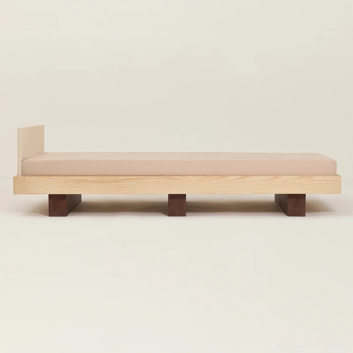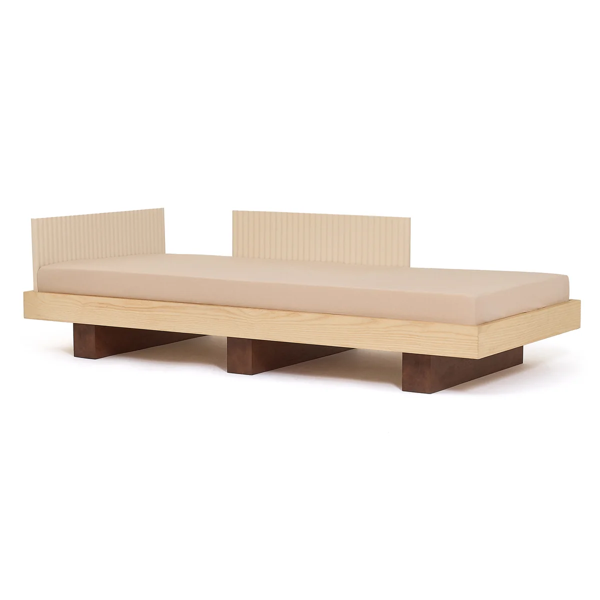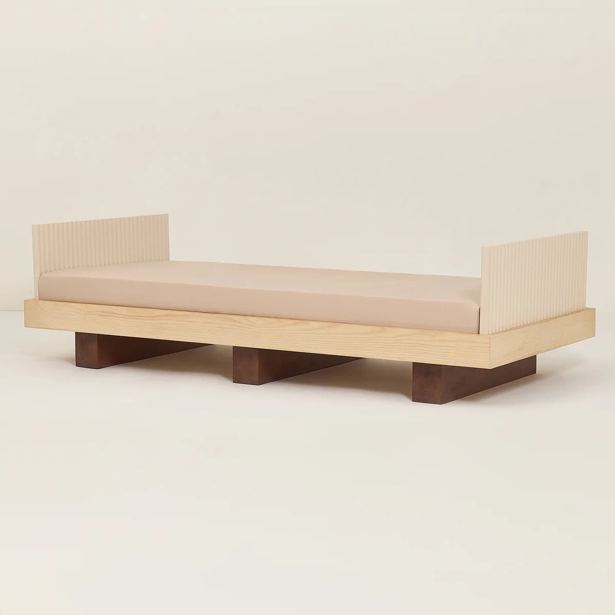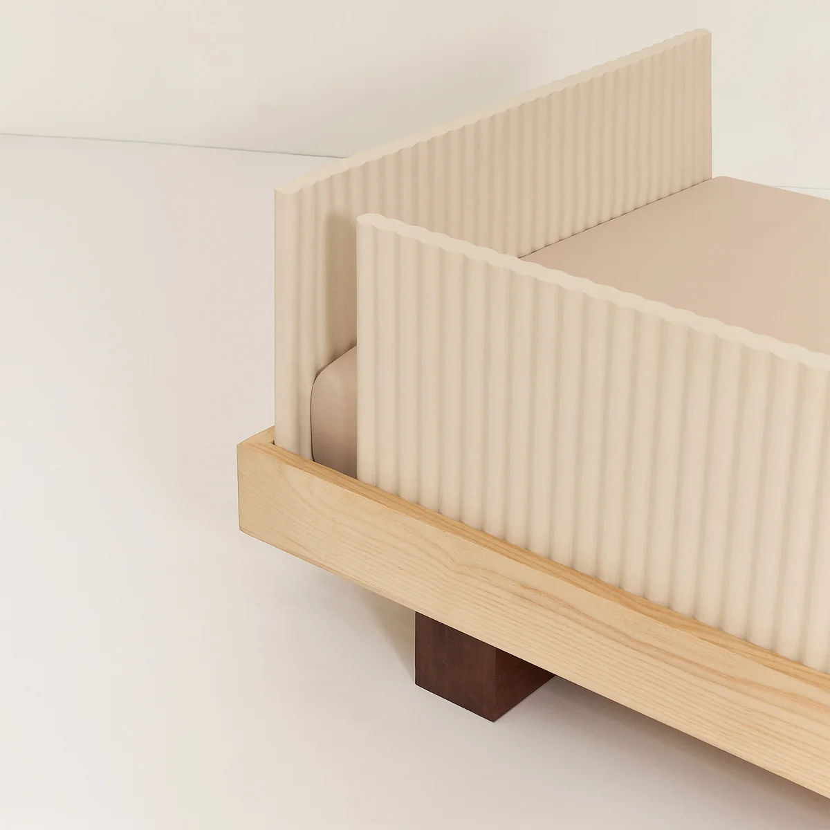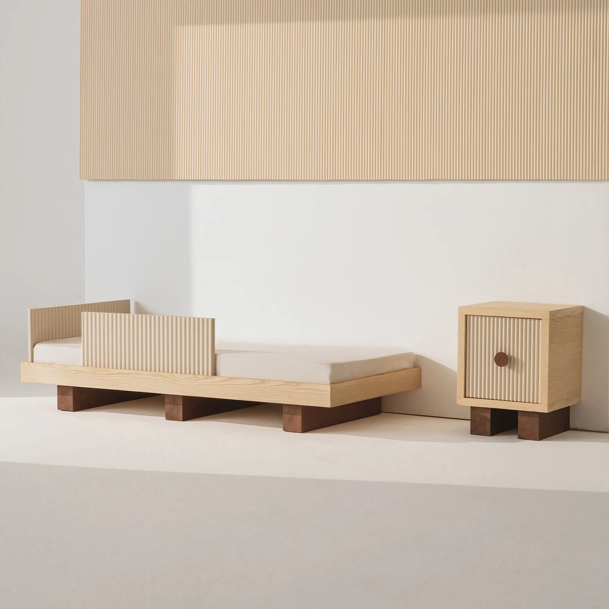 Les pieds de lit marqués, inspirés des sandales japonaises traditionnelles Geta, confèrent au design une élégante simplicité avec une référence culturelle. Les parties latérales avec de fines rainures créent un jeu captivant d'ombre et de lumière et invitent les enfants à explorer la structure avec les doigts - un mariage harmonieux entre l'esthétique et le toucher.