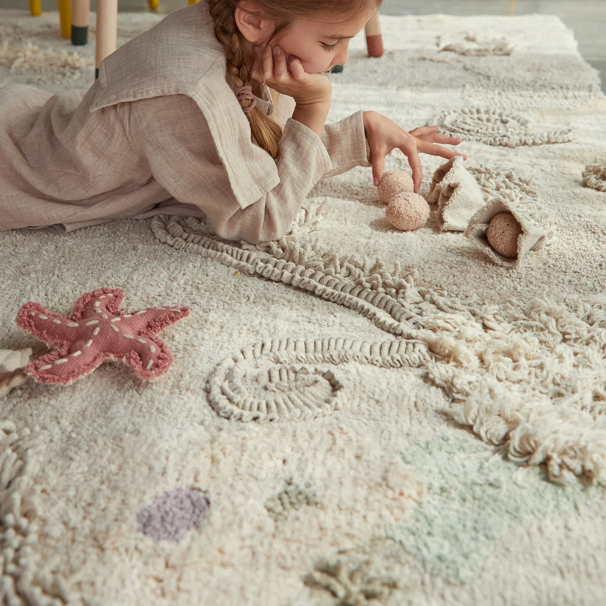 Le tapis de jeu Seabed avec accessoires de jeu de Lorena Canals plonge les enfants dans le monde infini des mers. Avec des éléments rêveurs, le tapis met en scène un paysage sous-marin magique et se présente dans des tons pastel légers qui s'intègrent dans tous les intérieurs. Les différentes textures et les accessoires de jeu fournis laissent libre cours à la créativité des petits chéris.