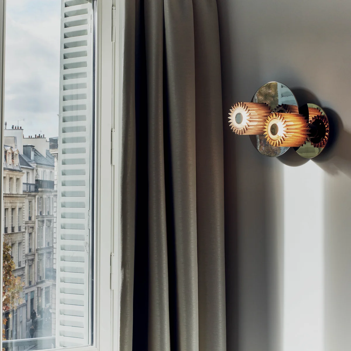 Le In the Sun L'applique murale de DCW a été créée dans le cadre de la rénovation du pavillon Dufour au château de Versailles. Il s'agit d'un hommage au Roi Soleil, conçu par Dominique Perrault et Gaëlle Lauriot-Prévost. Dans les maisons privées, l'applique murale brille dans des tons festifs d'or et d'argent et projette des ombres d'une beauté unique sur le mur. Le résultat est une atmosphère magique partout où il est utilisé, que ce soit dans le couloir, au-dessus du lit dans la chambre à coucher, au-dessus du canapé dans le salon.