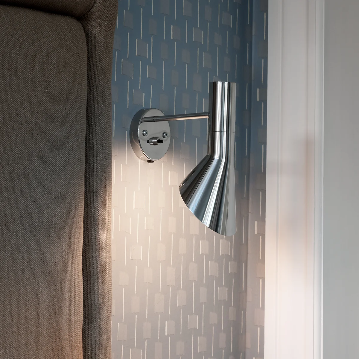 L'applique murale AJ a été conçue par l'icône du design danois Arne Jacobsen pour le Radisson SAS Royal Hotel de Copenhague, inauguré en 1960. Arne Jacobsen n'a pas seulement créé le bâtiment, il a également conçu l'ensemble de l'aménagement intérieur, entre autres les meubles, les couverts, les textiles et les luminaires, créant ainsi l'un des premiers hôtels design au monde.