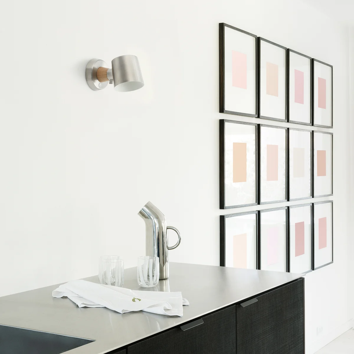 Le socle fabriqué en frêne offre un beau contraste avec l'abat-jour en acier thermolaqué d'aspect industriel. Le socle et l'abat-jour cylindrique sont reliés par une articulation pivotante. Il est ainsi possible de faire tourner l'abat-jour tout autour du socle et de régler la direction de la lumière. Il est ainsi possible de passer d'un éclairage direct à un éclairage indirect. Elle convient donc comme lampe de lecture et pour un éclairage d'ambiance.