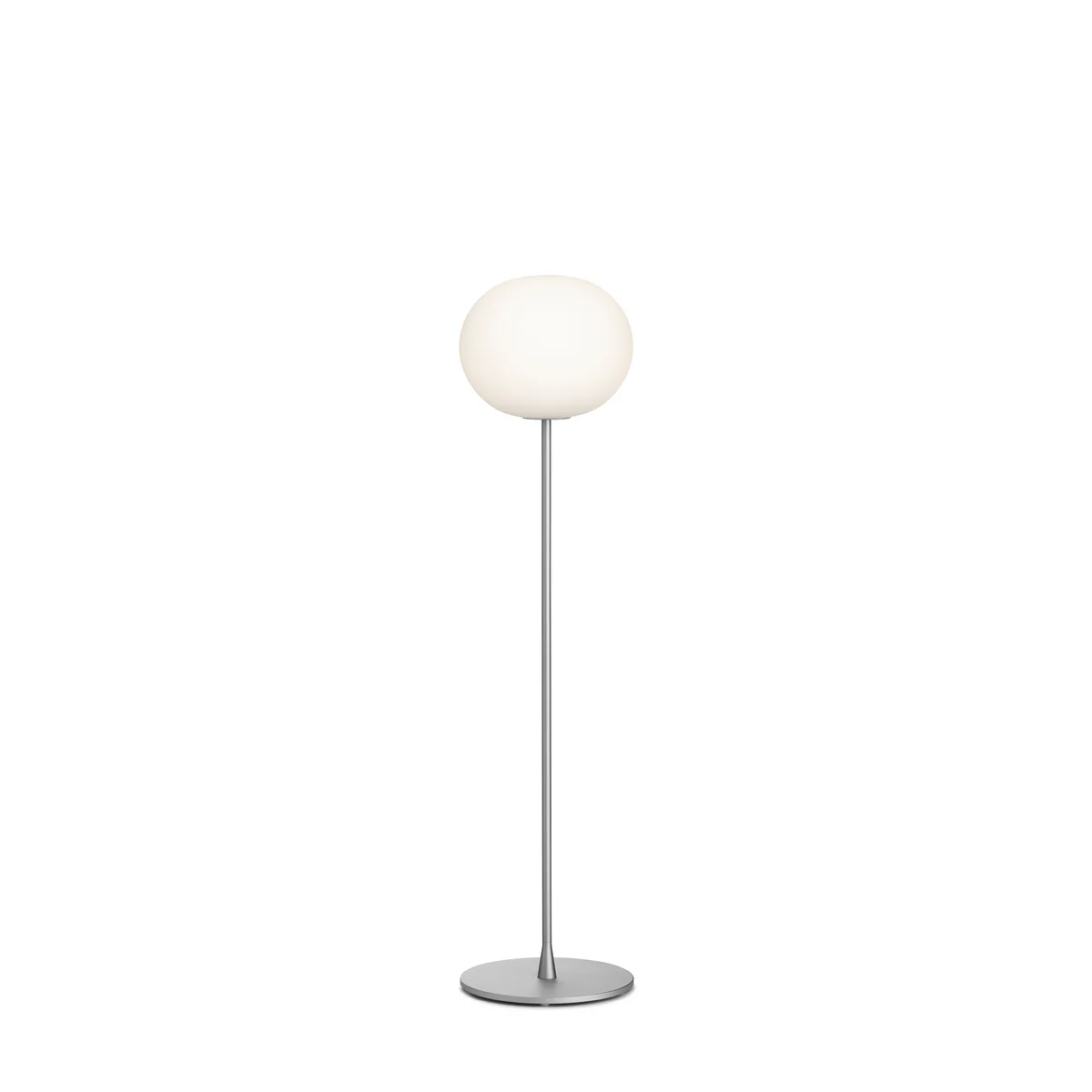 Le diffuseur de la Glo-Ball Lampadaire composé de verre opalin soufflé à la main avec une surface extérieure gravée et un anneau de recouvrement fileté en alliage d'aluminium moulé sous pression, plaqué de chrome alodine par galvanisation. La base est en acier massif, la tige en alliage d'aluminium moulé sous pression - tous les éléments sont peints ou chromés en argent mat.
