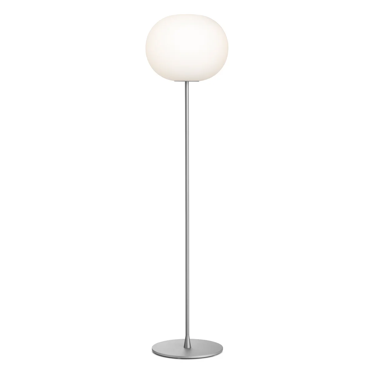 Le diffuseur de la Glo-Ball Lampadaire composé de verre opalin soufflé à la main avec une surface extérieure gravée et un anneau de recouvrement fileté en alliage d'aluminium moulé sous pression, plaqué de chrome alodine par galvanisation. La base est en acier massif, la tige en alliage d'aluminium moulé sous pression - tous les éléments sont peints ou chromés en argent mat.