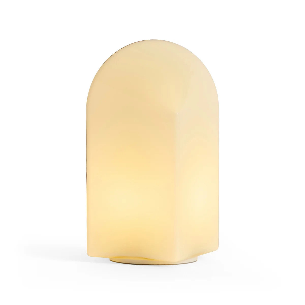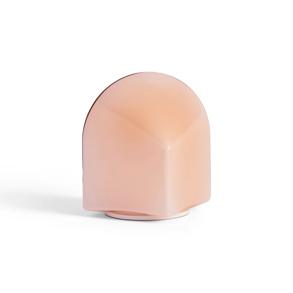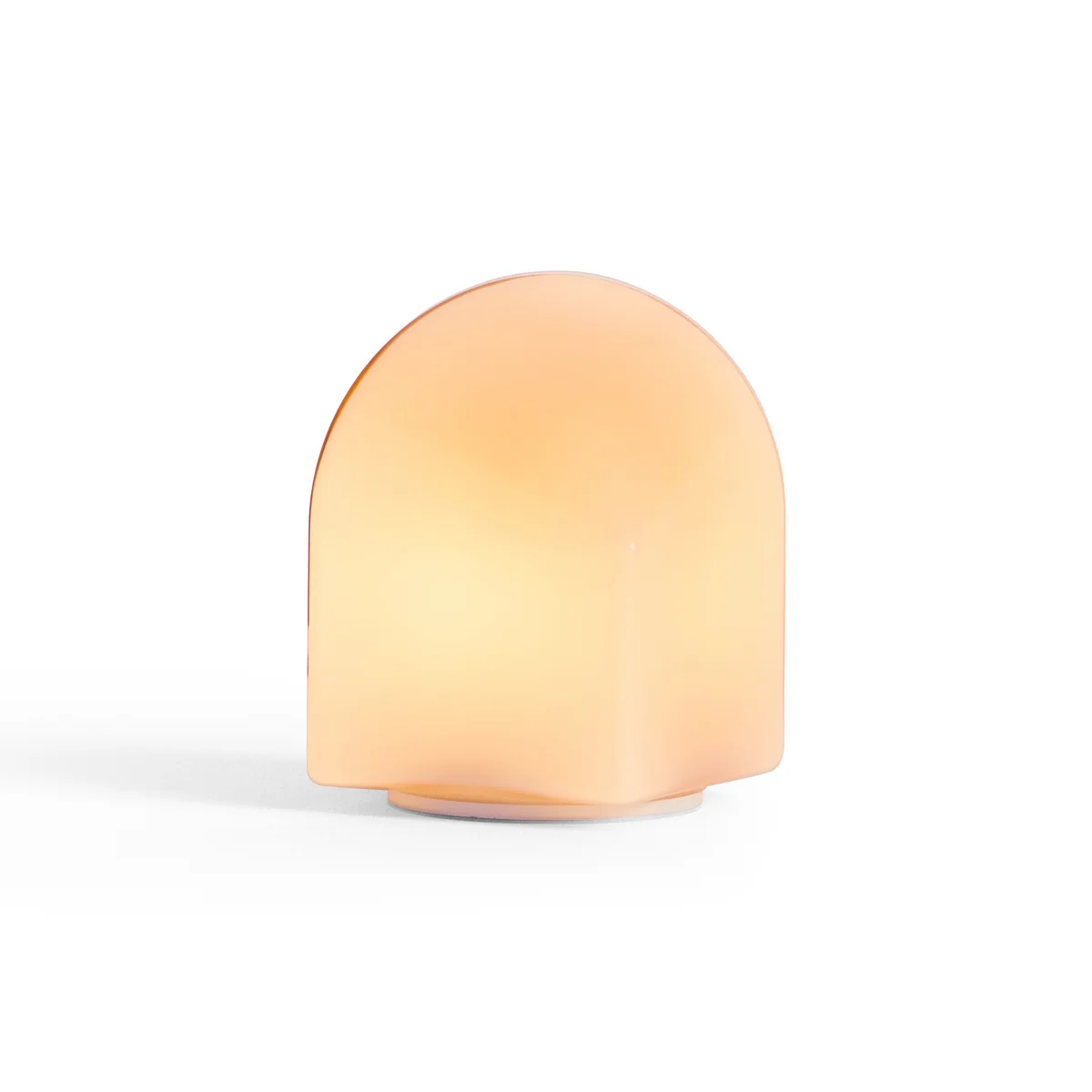 La lampe Parade Lampe de table portable de HAY, conçue par Viola Heyn-Johnsen et Jonas Trampedach, allie design sculptural et fonctionnalité. Avec sa forme géométrique, composée d'une base carrée et d'une partie supérieure bombée en verre coloré, la lampe change d'effet selon l'angle de vue.