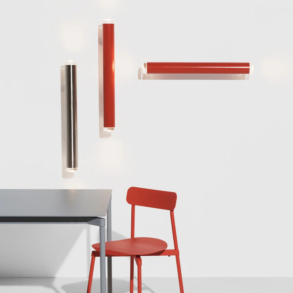 Les appliques et plafonniers Pyl, conçus par Marie & Alexandre pour Petite Friture , sont disponibles en deux tailles et se caractérisent par des formes architecturales épurées. Fabriqués en tubes d'acier polis et peints avec les cônes caractéristiques de la série, ils combinent rigueur industrielle et expression décorative. Le verre moulé diffuse la lumière en douceur tout en jouant avec des motifs graphiques.