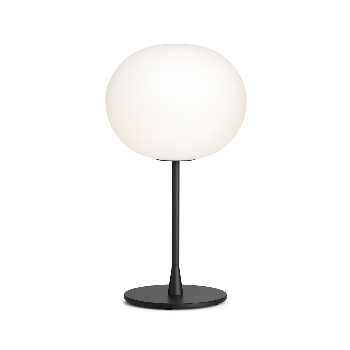 Le diffuseur de la Glo-Ball Lampe de table en verre opalin soufflé à la main avec une surface extérieure gravée et un anneau de couverture fileté en alliage d'aluminium moulé sous pression. La base ronde est en acier massif peint en noir et l'arbre étroit est également en acier tubulaire noir.