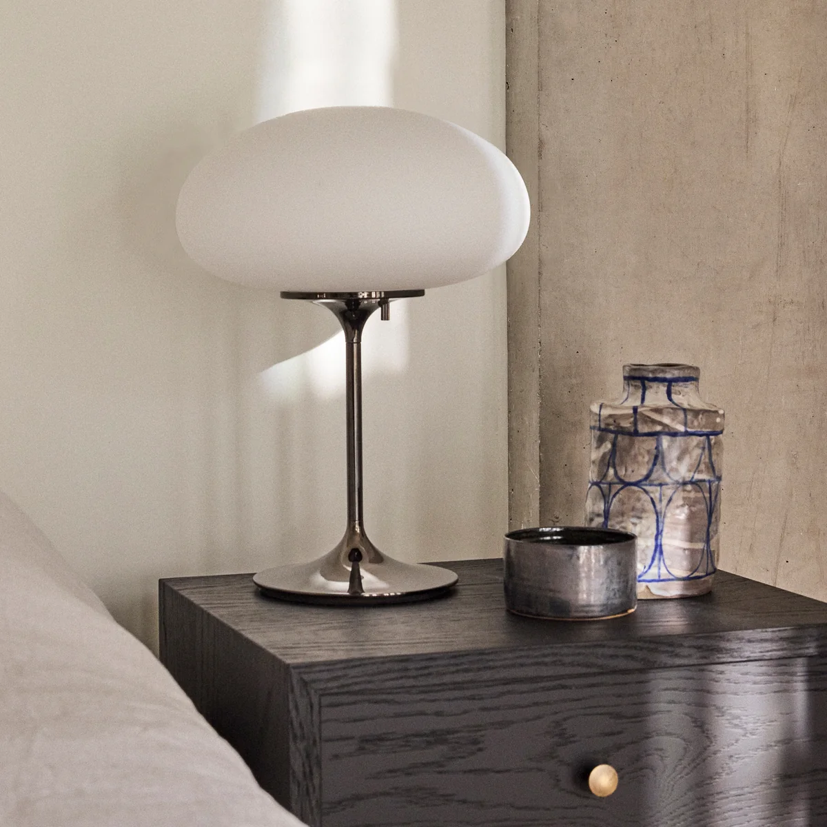La lampe Stemlite lampe de table de Gubi , conçue par Bill Curry en 1962, est considérée comme un jalon de la conception moderne de l'éclairage. En tant que première lampe dite "total look", elle remplaçait Stemlite la combinaison classique d'un pied et d'un abat-jour par une unité fermée et sculpturale avec des modules interchangeables - une approche révolutionnaire pour l'époque.