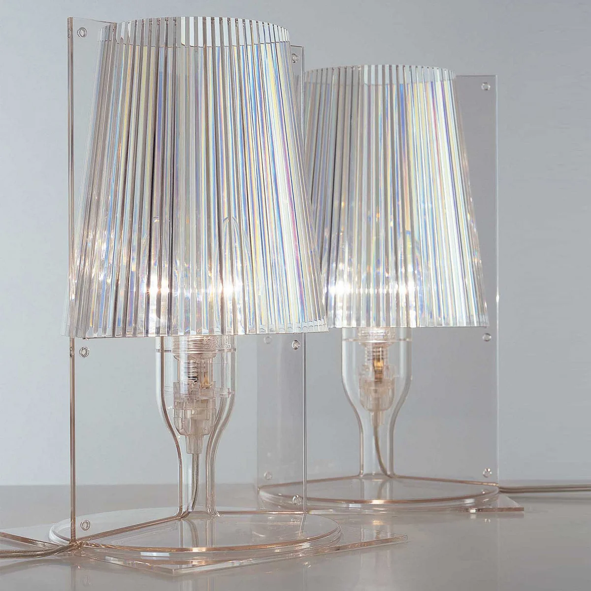 La lampe de table Take de Kartell est une création du designer Ferruccio Laviani. D'une conception simple mais raffinée, elle attire l'attention sur la table de nuit ou la commode. La lampe de table Take est fabriquée en polycarbonate transparent selon un procédé de moulage par injection. La forme résulte de l'assemblage de deux pièces symétriques qui, mises bout à bout, donnent la forme d'une lampe. L'abat-jour est plissé à l'intérieur, ce qui confère à la lampe un look classique.