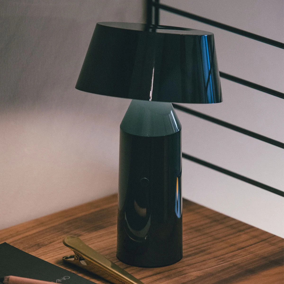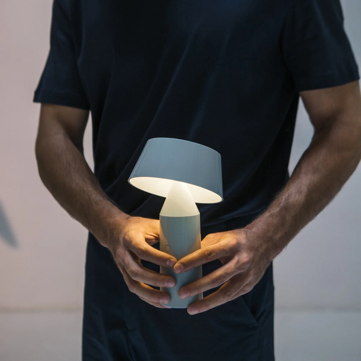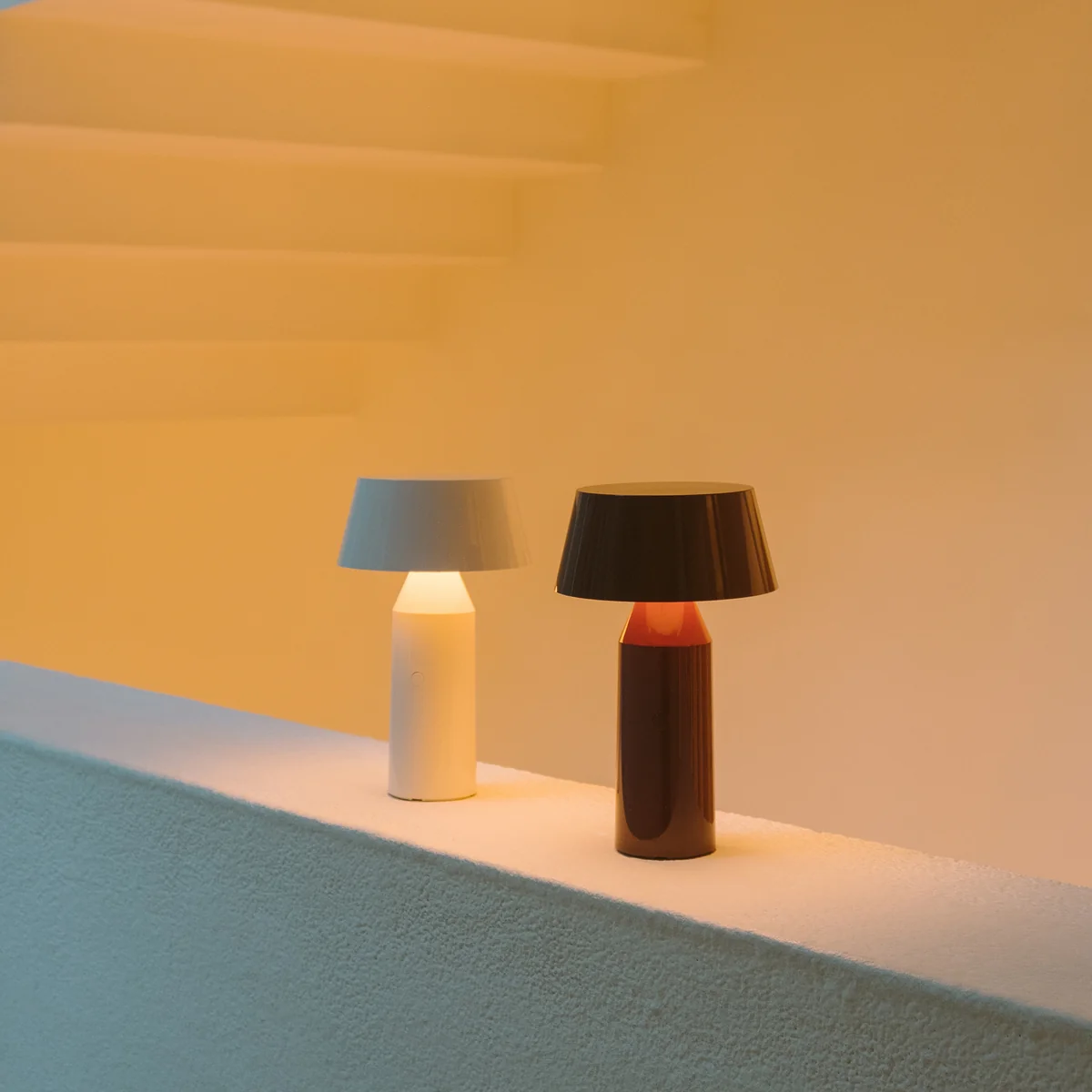 Avec sa lumière confortable et chaleureuse, cette lampe colorée garantit des moments inoubliables, quel que soit l'endroit où elle est placée. Elle est sans fil et équipée d'une batterie à faible consommation d'énergie. Christophe Mathieu a conçu la Bicoca Akku LED lampe de table en 2017 pour marset. La forme géométrique de la Bicoca lampe est en polycarbonate et peut être orientée à volonté grâce à son abat-jour mobile. L'articulation est fabriquée dans un mélange d'acier inoxydable et de téflon.