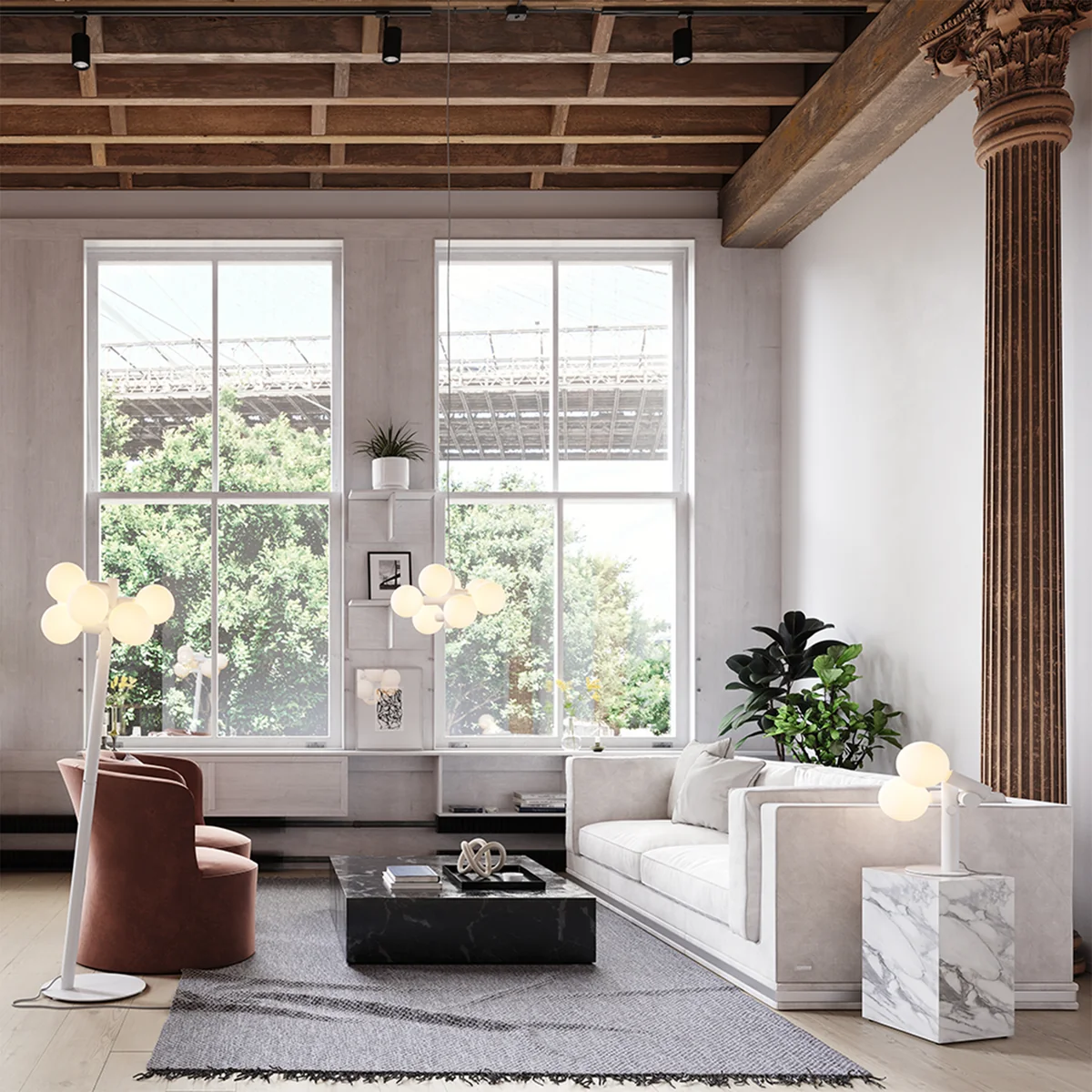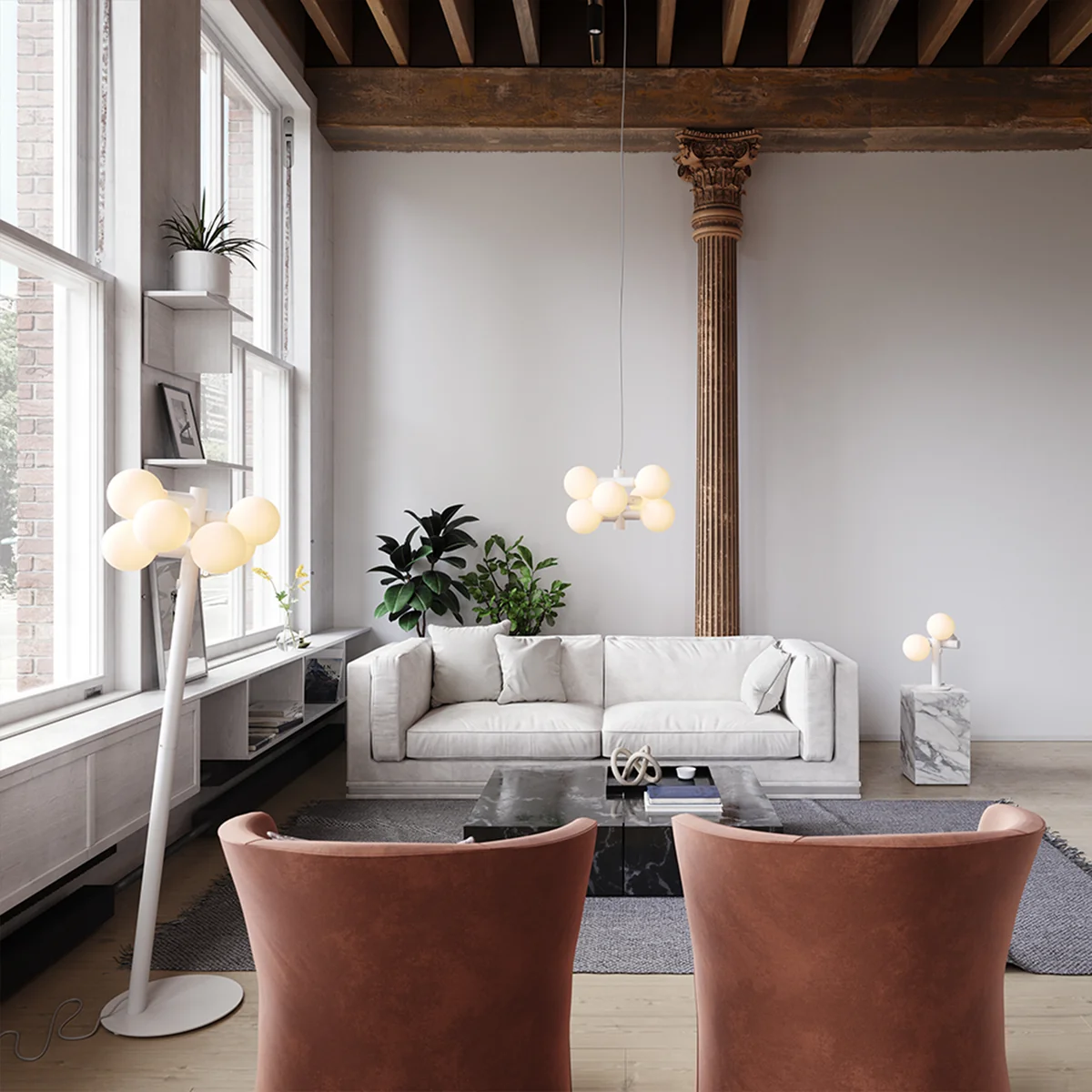 Le site Echo est composée de trois cylindres en acier qui se croisent et d'un variateur rotatif spécial à la base. Elle est revêtue d'une peinture en poudre blanche. Le site Echo est fournie avec deux ampoules Sphere IV, qui offrent des performances inégalées de Dim à Warm.