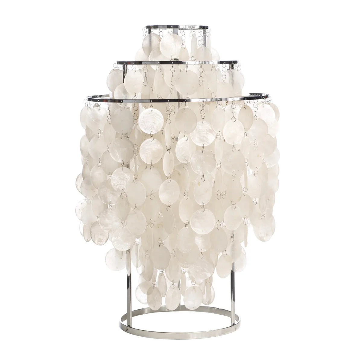 De nombreux éléments en nacre sont reliés entre eux sur la lampe par des anneaux métalliques. Les chaînes sont attachées à trois anneaux métalliques au milieu desquels se trouve la lampe. Lorsque la lampe est allumée, un doux jeu d'ombre et de lumière se crée, créant ainsi une atmosphère chaleureuse dans la pièce. Le léger tintement de la nacre lorsqu'une brise souffle a un effet calmant.