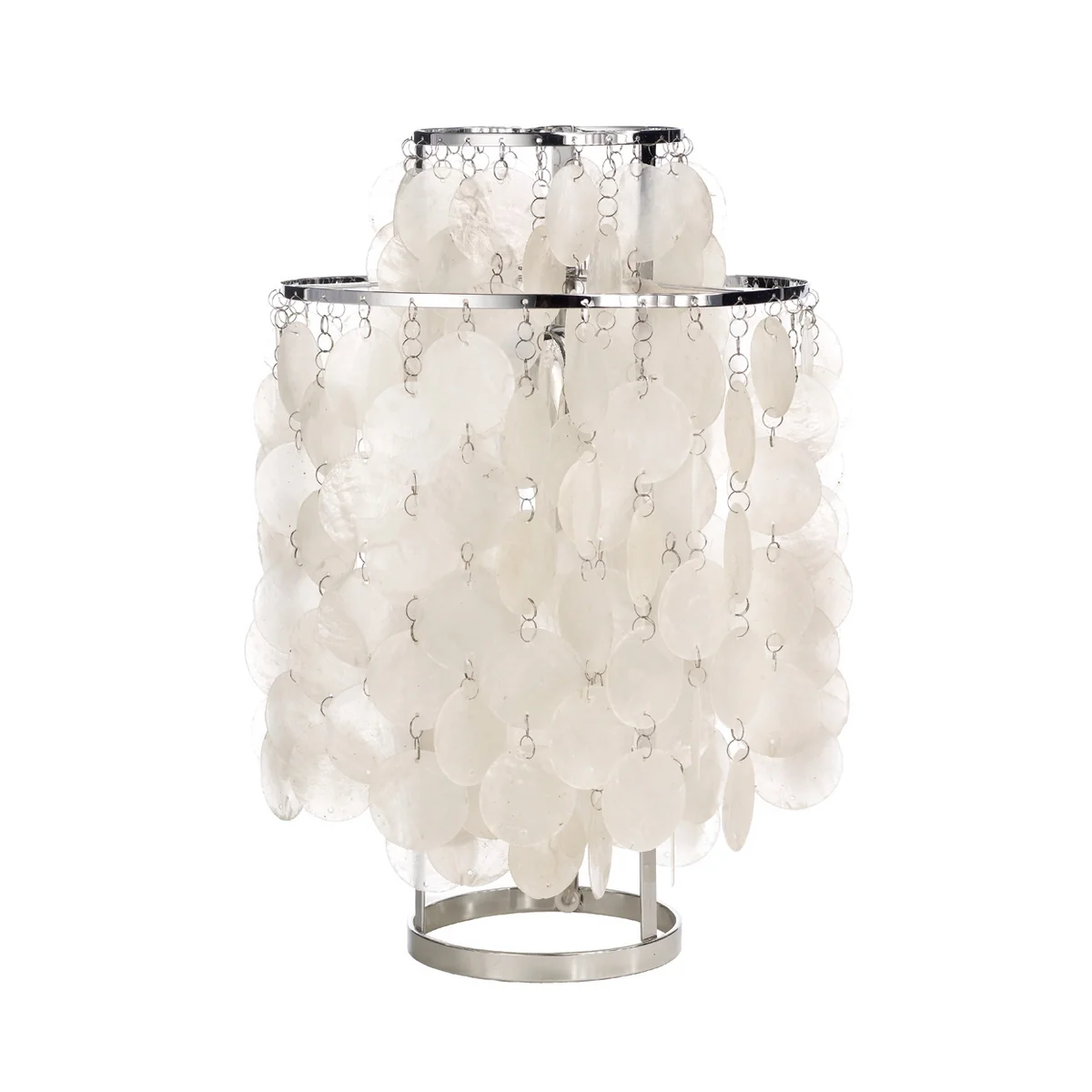 La lampe de table Fun 2TM se caractérise par ses nombreux éléments en nacre, qui ne sont reliés par aucun anneau métallique. Les colliers de nacre sont suspendus à deux anneaux métalliques au milieu desquels se trouve la lampe. De cette façon, le luminaire émet une lumière douce qui crée une atmosphère chaleureuse dans la pièce. Si la lampe est en mouvement, les plaques de nacre tintent légèrement, ce qui rappelle un carillon et a un effet particulièrement apaisant.