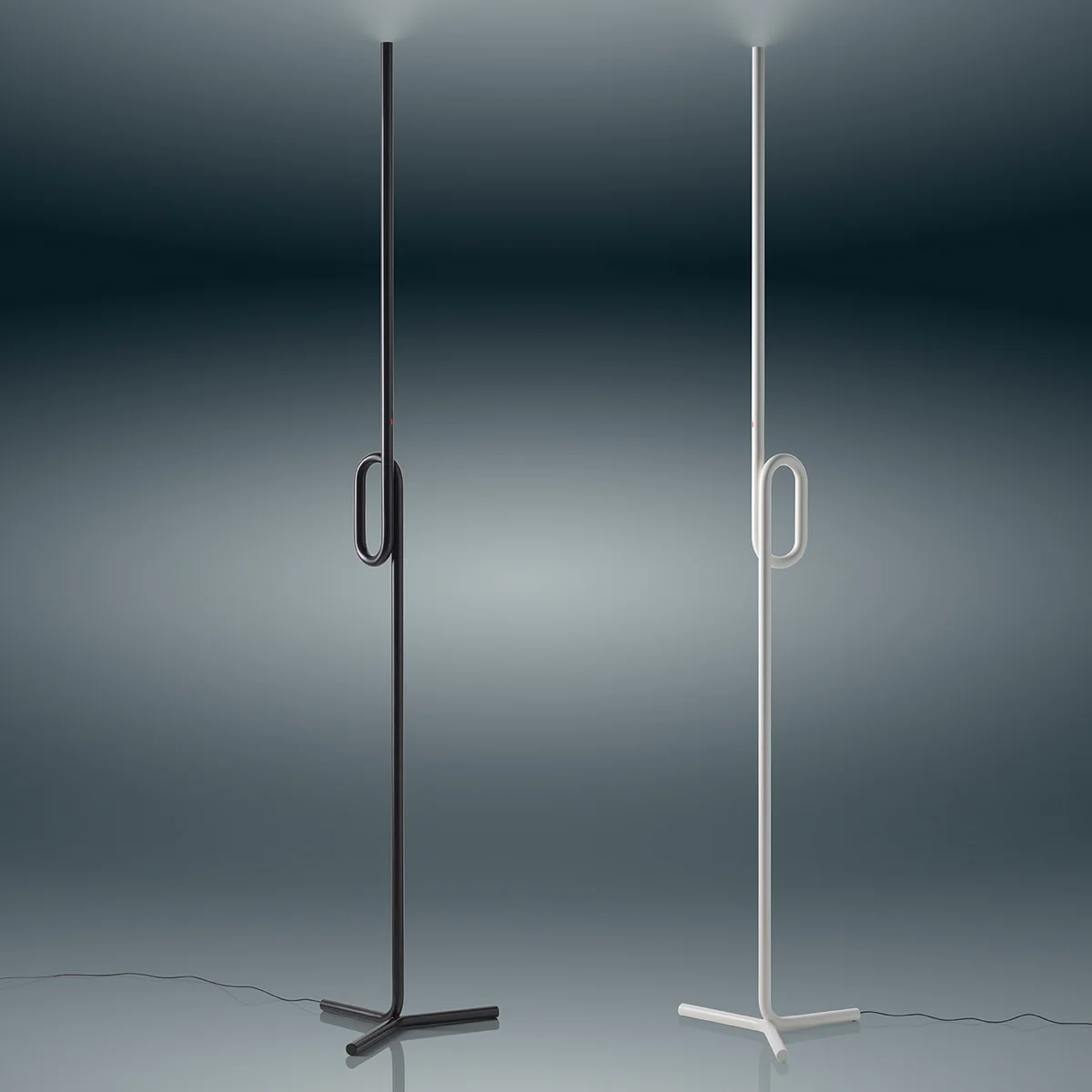 La lampe se compose d'un tube laqué en métal et aluminium, disponible en différentes couleurs. L'intensité lumineuse peut être réglée via un variateur tactile dans la zone du nœud.