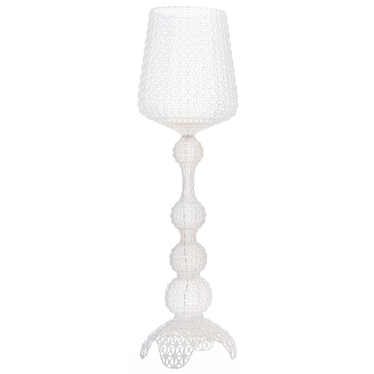 Le lampadaire LED Kabuki de Pietro Ferruccio Laviani pour Kartell est une diva néobaroque dans une robe en dentelle. S'inspirant des grands décors détaillés du théâtre japonais Kabuki, Laviani associe ses idées avec une production moderne et fabrique le luminaire en plastique teinté et moulé dans la masse.