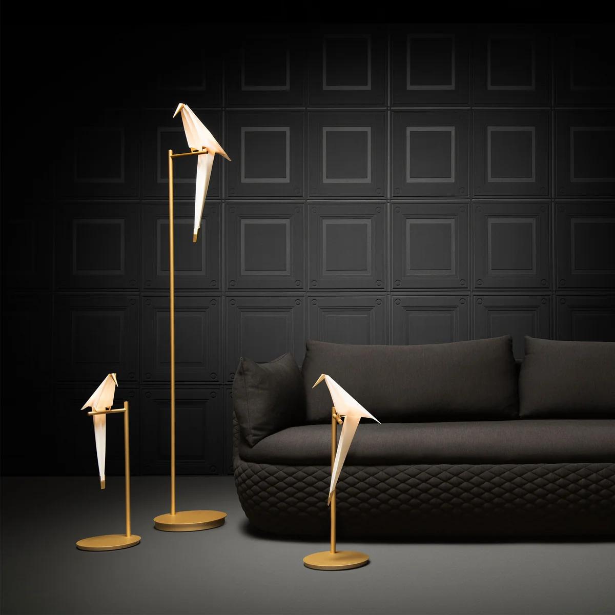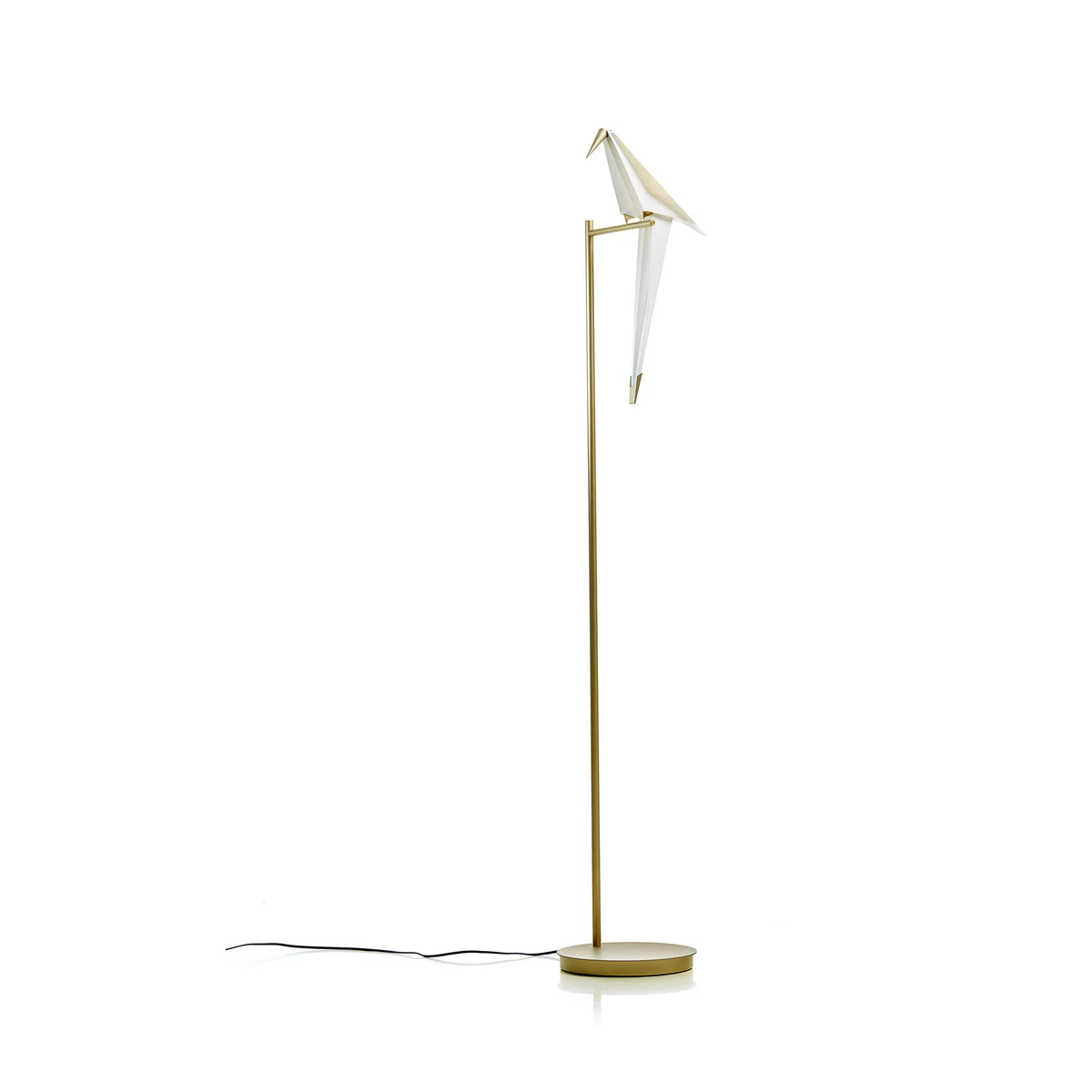 Le lampadaire Perch Lamp LED Branch a été conçu par le designer Umut Yamac pour le fabricant Moooi. L'apparence de la lampe est marquée par l'oiseau sur le poteau. Par un toucher ou un courant d'air, l'oiseau Origami voit d'avant en arrière et peut être retiré de la barre et retourné. Le cadre est léger et filigrane et est basé sur une perche d'oiseau.