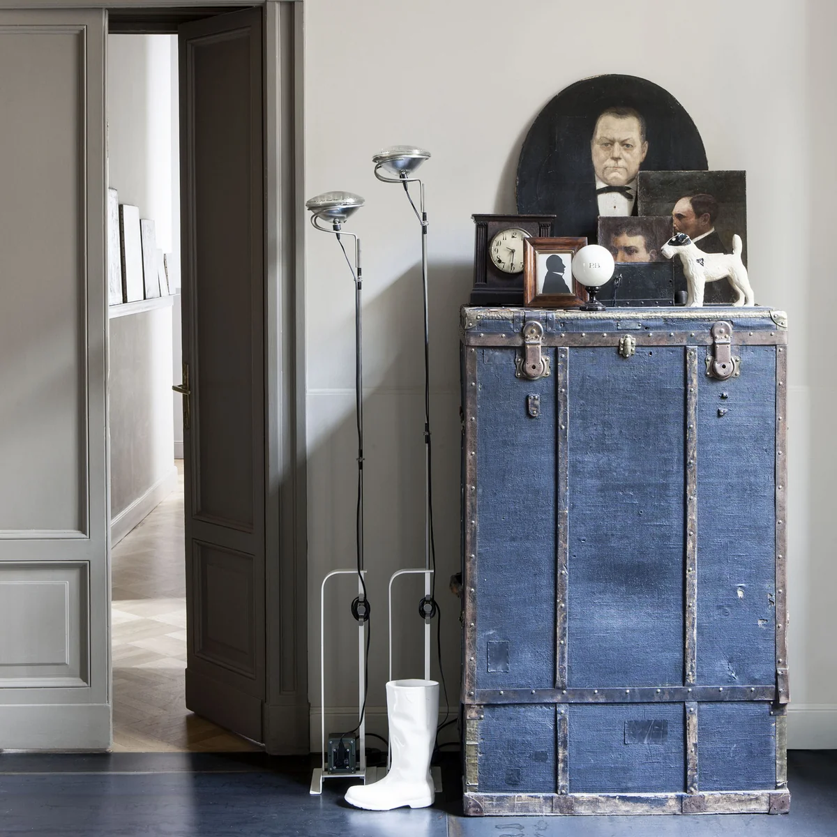 Le projecteur de plafond réglable en hauteur Toio fut dessiné en 1962 par Achille et Pier Giacomo Castiglioni pour Flos. Un phare de voiture est utilisé comme réflecteur et les frères Castiglioni montrent en même temps l'ironie du Ready-Made-Design.