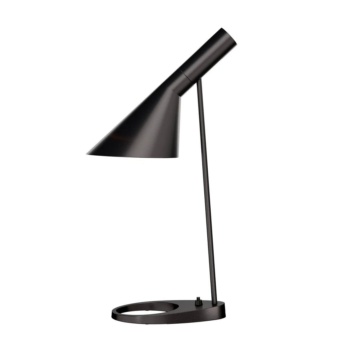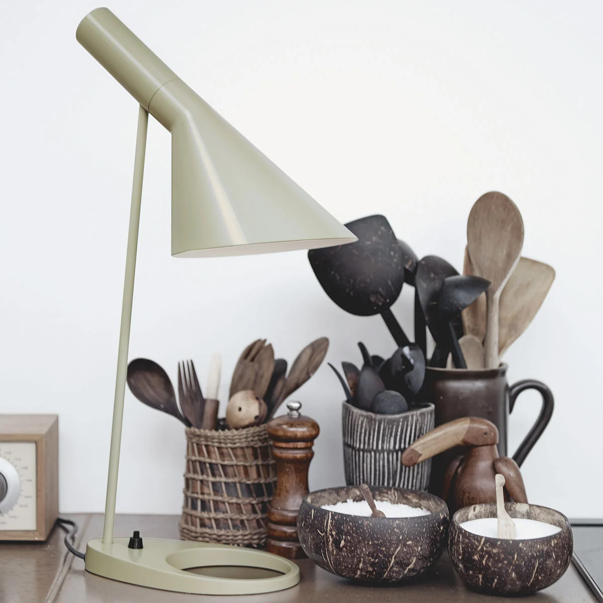 La lampe de table AJ est basée sur les mêmes principes que le lampadaire AJ, mais pour une meilleure utilisation comme lampe de travail, l'abat-jour a été agrandi. L'angle de l'abat-jour métallique conique est conçu de manière à correspondre à l'angle du support de lampe. C'est en tout cas ce qui était prévu à l'origine, mais en réalité, l'angle a été légèrement ajusté à titre de correction optique. Lorsque la lampe est inclinée vers le bas, le bord du support de lampe est horizontal. L'intérieur de l'abat-jour est émaillé en blanc mat. L'écran est efficace, on ne peut pas voir dans la source lumineuse.