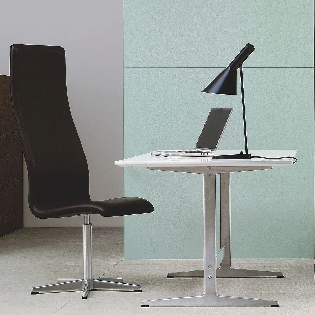 La lampe de table Arne Jacobsen se distingue par son abat-jour pivotant exceptionnel, dont la forme asymétrique répartit la lumière en conséquence. Le pied de la lampe, avec son ouverture caractéristique, contribue à l'élégance et à l'apesanteur du design. Ainsi, elle fait partie depuis longtemps des classiques modernes du design du 20. siècle.