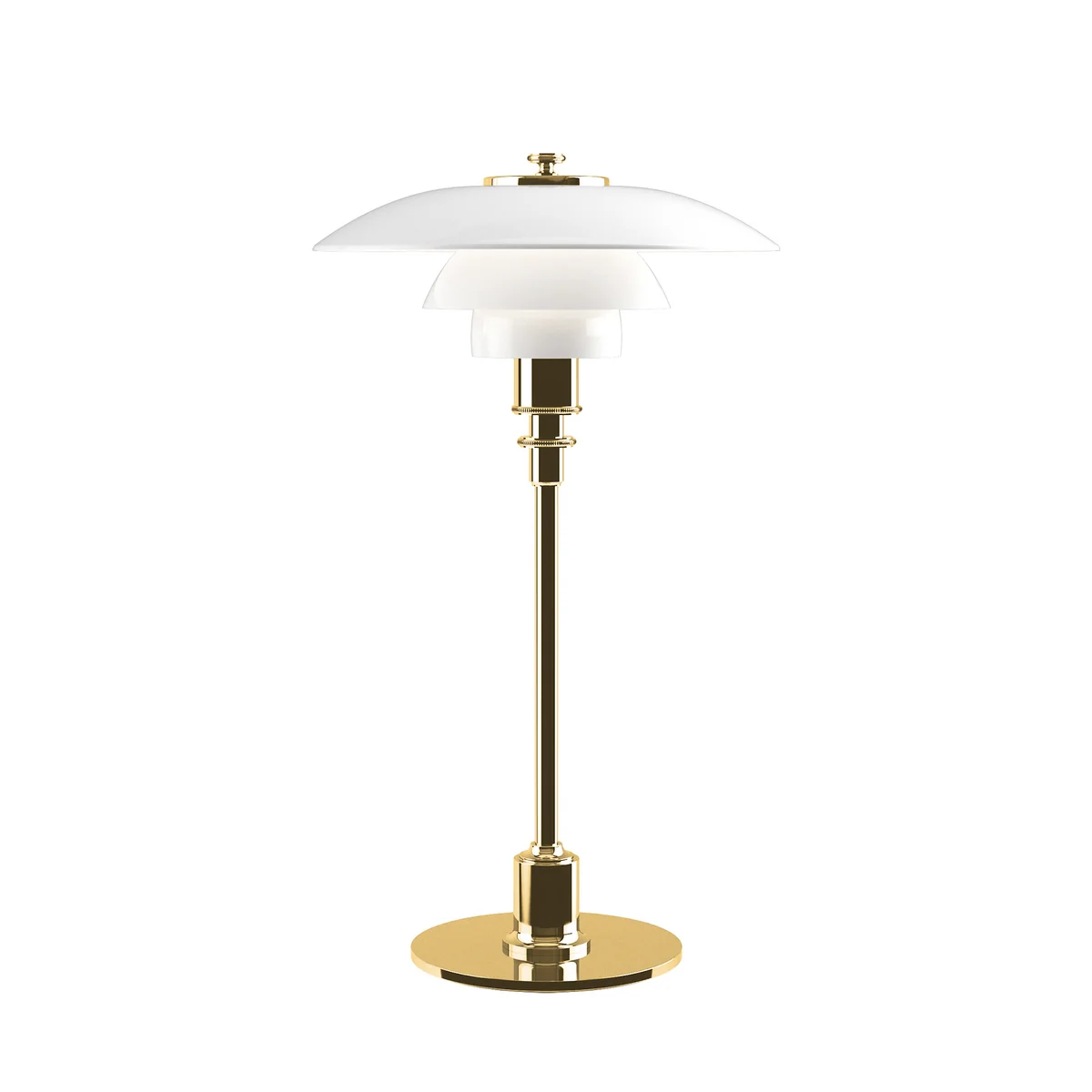 La petite lampe de table PH 2/1 a été conçue sur le principe d'un système réfléchissant à trois abat-jour qui dirige la majeure partie de la lumière vers le bas. Les trois abat-jour sont fabriqués par Louis Poulsen en verre soufflé à la bouche et opalisé à trois couches. Les abat-jour sont brillants à l'intérieur et sablés à l'extérieur, ce qui permet de diffuser une lumière douce et diffuse. Le socle est disponible au choix en aluminium étiré chromé brillant, en laiton ou métallisé noir. Le câble textile est noir.