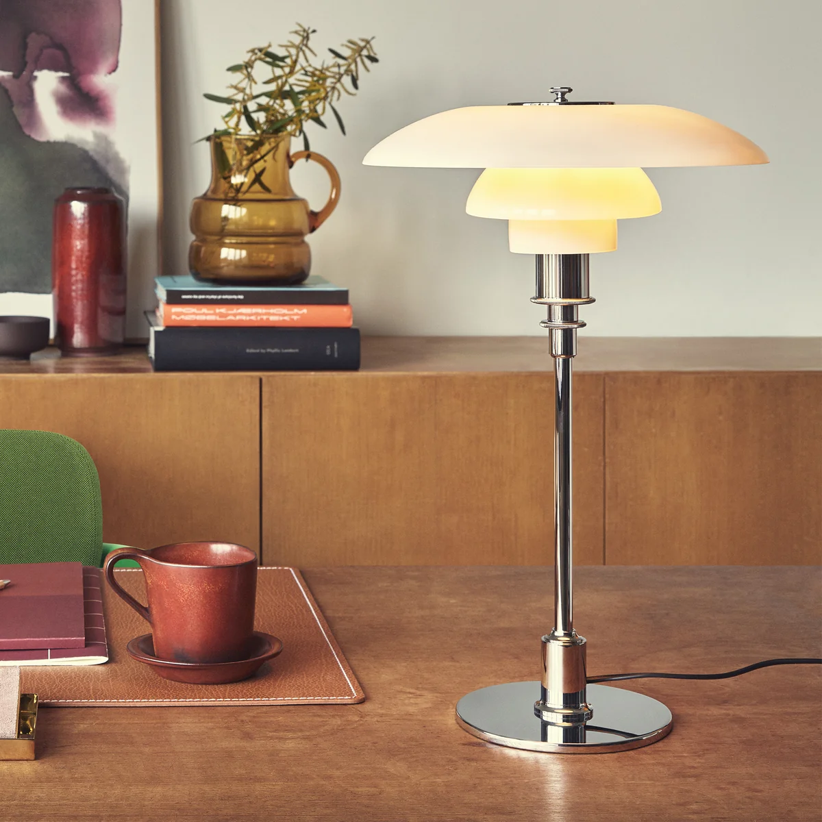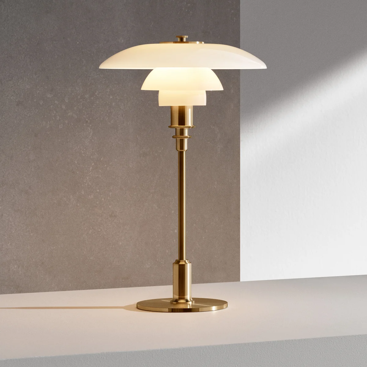 C'est le cas de la lampe de table PH 3/2, qui diffuse une lumière agréablement douce. Elle est réfléchie par plusieurs abat-jour et diffusée dans la pièce sans éblouissement, les réflexions sont guidées par les abat-jour via une spirale logarithmique au foyer de laquelle est placée la source lumineuse. Les dimensions des écrans correspondent au rapport 3:2:1 - Chaque écran réduit la quantité de lumière.