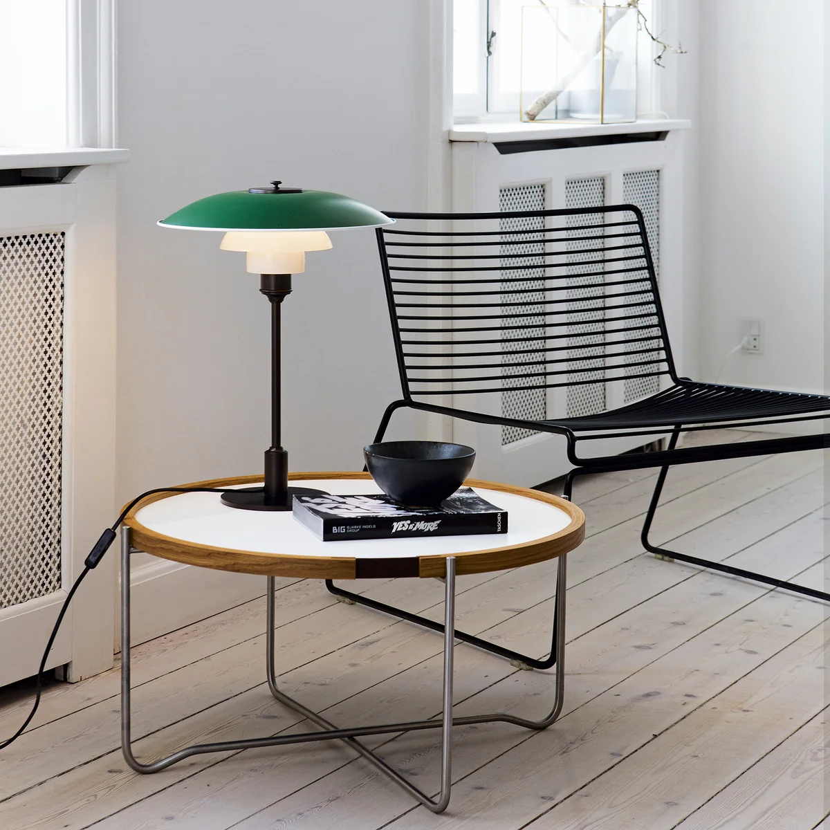 La lampe de table PH 3½-2½ est équipée d'une douille E14 dans laquelle s'adaptent un grand choix de sources lumineuses, dont plusieurs variantes de LED. Le luminaire est 100 % sans éblouissement.