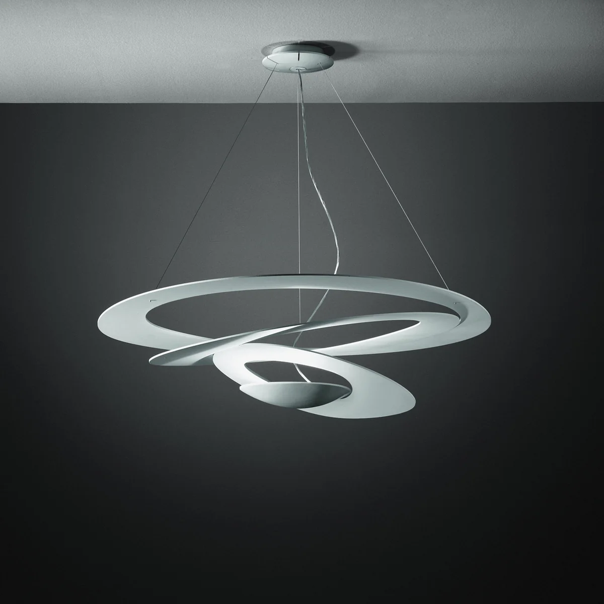 Le Pirce Sospensione été conçu par Giuseppe Maurizio Scutellà pour le fabricant d'éclairage italien Artemide . Le design de Pirce ressemble au résultat d'une silhouette: le disque fin se fond dans des anneaux légèrement incurvés qui s'enroulent vers le bas. En fonction de la durée de suspension, la silhouette du Pierce devient plus plate ou allongée.