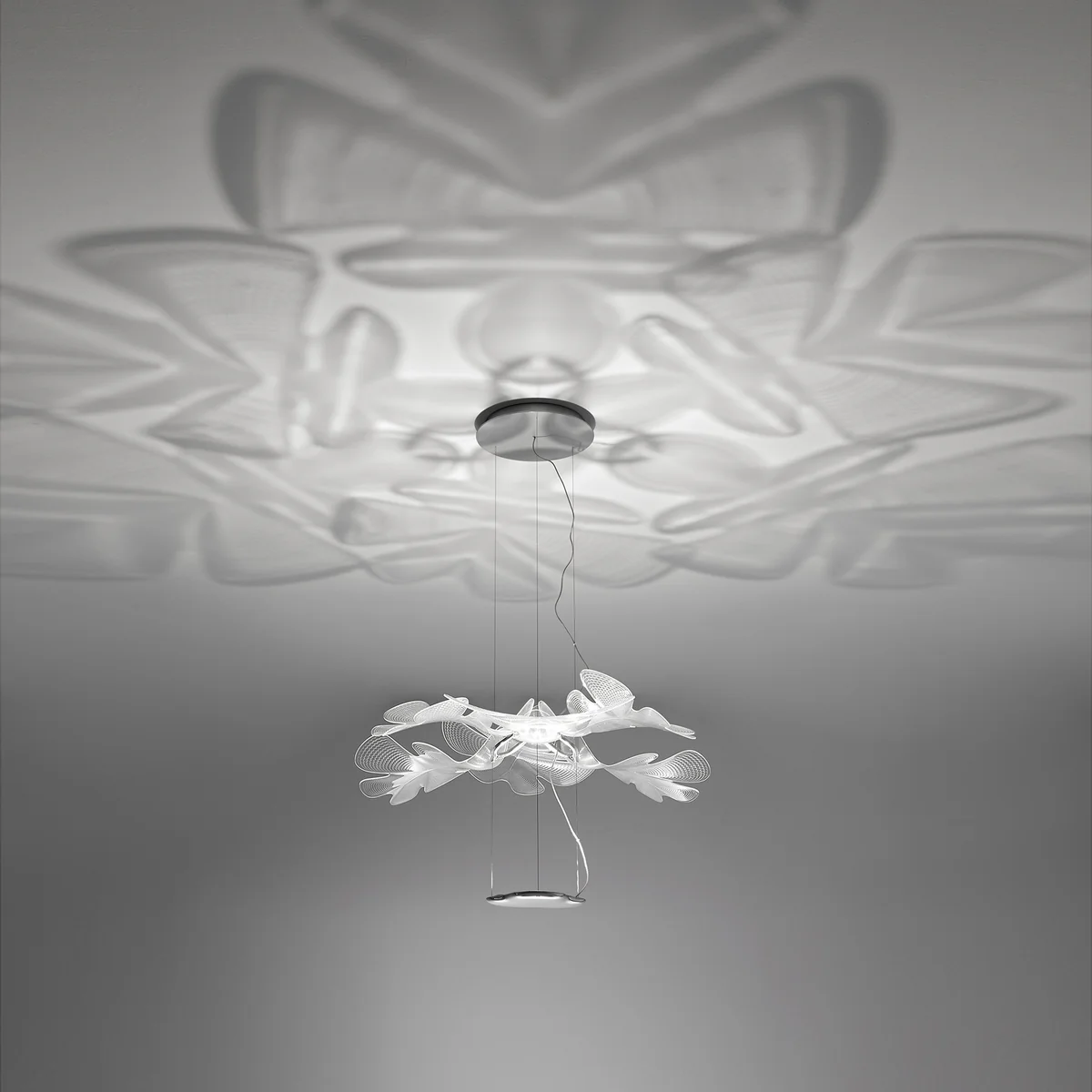 Sous les fleurs soigneusement disposées et les feuilles constituées d'éléments en plastique phytomorphique légèrement transparents, se trouve l'élément lumineux comprenant un module LED puissant. La lumière est rayonnée directement sur le plafond, réfléchie par le bouquet et ainsi doucement diffusée dans la pièce. La Chlorophilia Sospensione LED permet ainsi d'obtenir un effet lumineux sans éblouissement, uniforme et lumineux qui convient à un grand nombre de pièces. Le luminaire peut être facilement contrôlé et utilisé avec Artemide App Control.