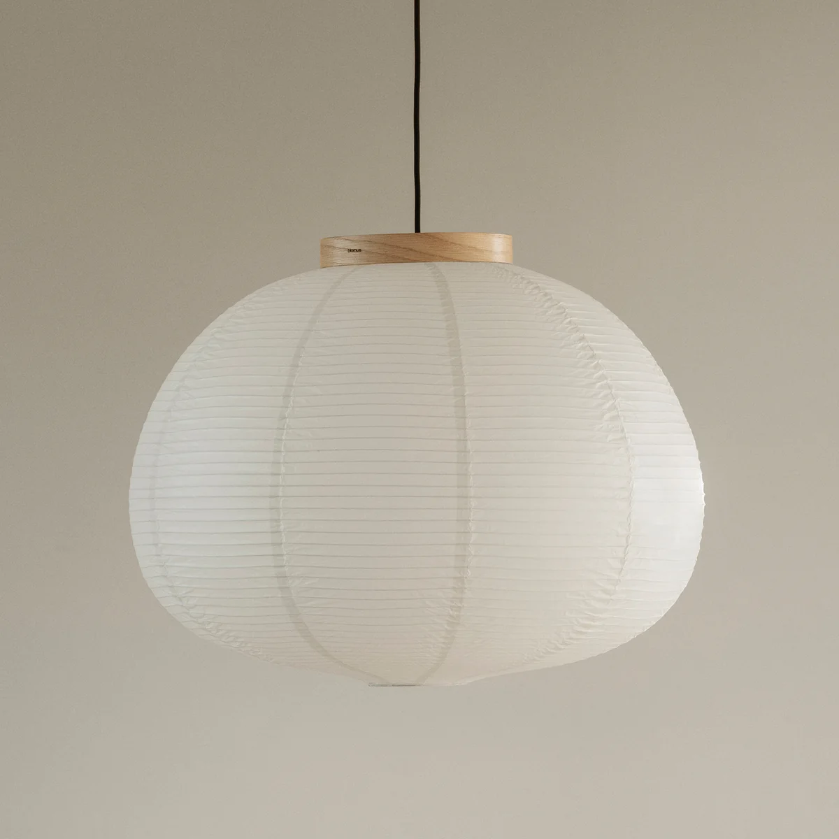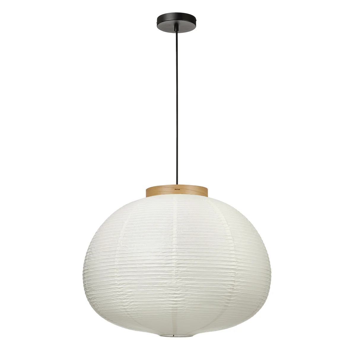 Le luminaire est livré démonté. Pour le montage, l'abat-jour en papier de riz est délicatement enfilé sur la structure métallique peinte en noir mat par poudrage. Après avoir vissé une ampoule LED E27 adaptée (non comprise dans la livraison), la suspension peut être installée de manière flexible à l'endroit souhaité au plafond.