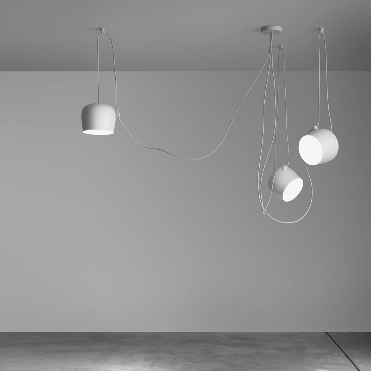 Le premier de ces principes est le centre géométrique du point lumineux : les luminaires sont généralement suspendus au centre des pièces. Avec le luminaire suspendu AIM, ce principe ne joue plus aucun rôle ; la mise à la terre se fait par de longs câbles. Comme deuxième principe, les deux concepteurs rompent avec l'hypothèse selon laquelle le câble n'est qu'un moyen pour atteindre un but et doit donc être caché : Avec l'AIM de Flos , une forêt de câbles peut émerger, avec des lignes impétueuses et comme une fonction esthétique.