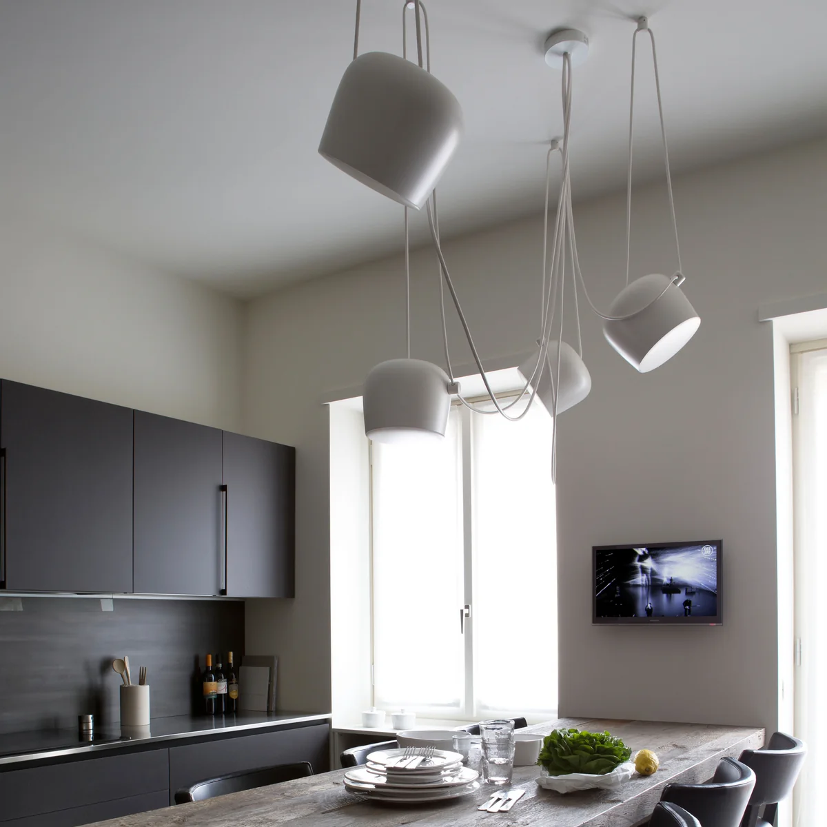 Flos fabrique l'AIM en aluminium poli, en ABS et en polycarbonate. Grâce à ses LED gradables, le luminaire suspendu AIM est économe en énergie et peut créer différentes ambiances lumineuses dans la pièce, tandis que son câble de 9 mètres permet toutes les variantes de suspension.