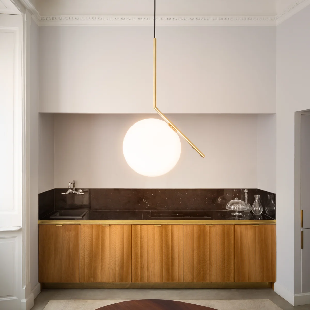 ic La suspension IC est fabriquée en acier par Flos et est disponible en laiton brossé et en laiton bronzé brossé ic h. Les deux variantes sont recouvertes d'une laque transparente afin de conserver leur éclat pendant de nombreuses années.