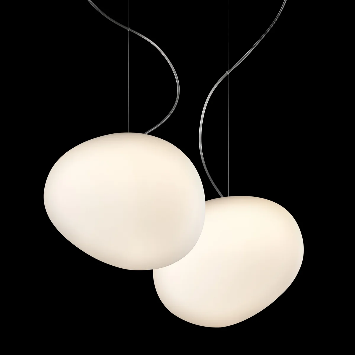 Le luminaire Gregg luminaire suspendu LED a été conçu par les architectes et designers italiens Ludovica et Roberto Palomba. La forme asymétrique ainsi que la surface blanche satinée rappellent fortement les galets polis par l'eau. Avec sa silhouette sculpturale, ce luminaire délicat se présente sous une forme différente à chaque angle de vue, ce qui en fait un véritable accroche-regard.