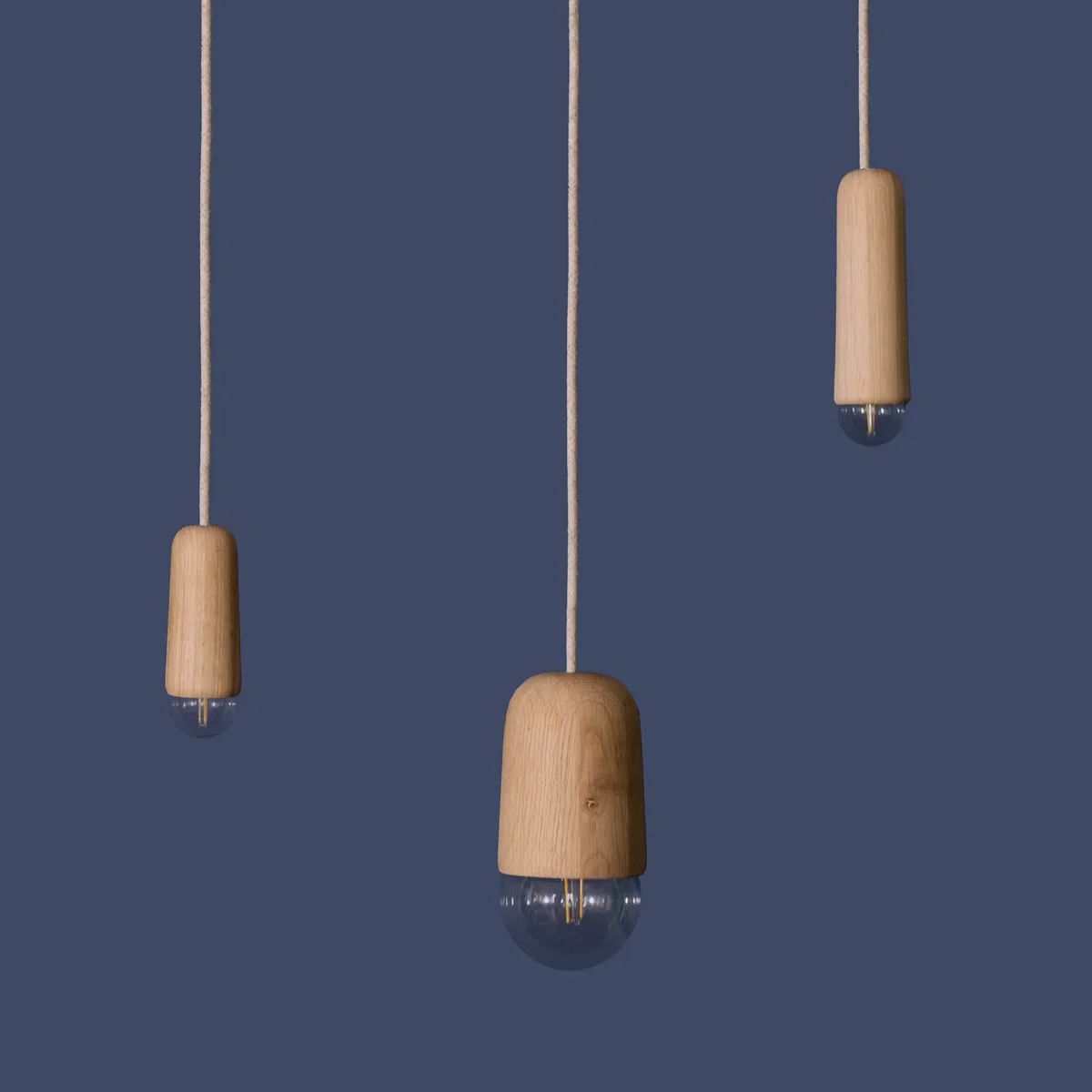 Composé d'un câble textile, d'une gaine en bois de chêne pour la douille et d'une ampoule bien protégée par la gaine en bois de chêne, ce luminaire dégage une atmosphère apaisante et offre une lumière chaleureuse dans chaque pièce.
