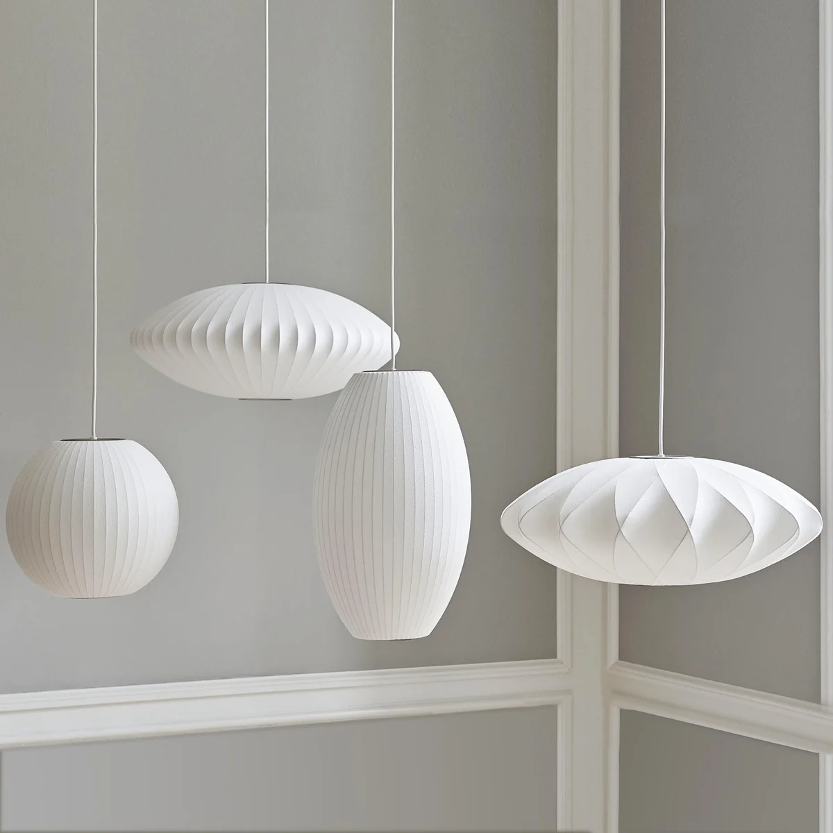 La suspension Nelson Saucer Bubble est un objet de design emblématique de l'époque du Mid-Century. Conçue en 1952 par George Nelson, elle compte encore aujourd'hui parmi les classiques du design d'intérieur moderne. Avec sa forme légèrement organique et son abat-jour blanc cassé en polymère translucide, elle crée une lumière chaude et diffuse qui confère une atmosphère confortable aux salons, salles à manger ou chambres à coucher.
