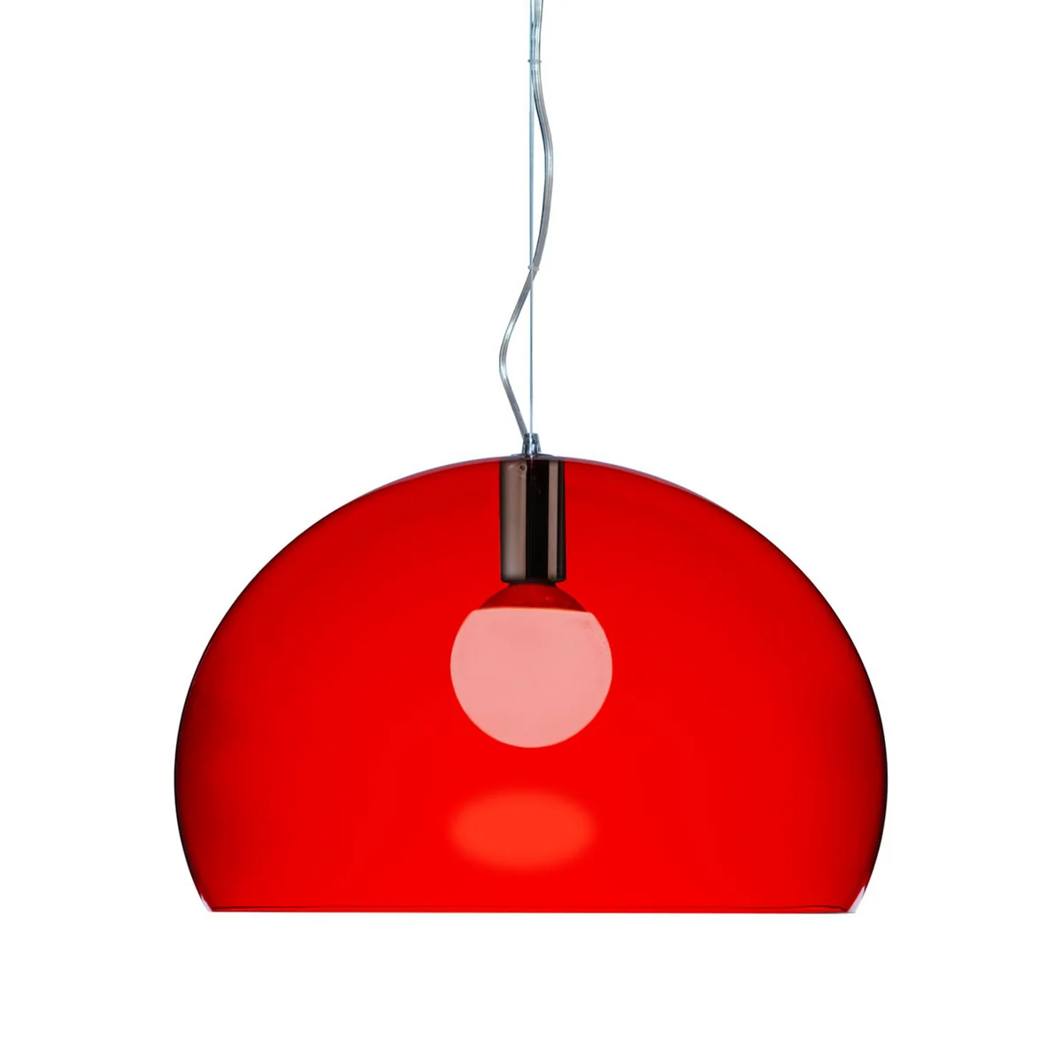 En version colorée pour la chambre d'enfant, en noir ou blanc pour la cuisine ou dans l'une des élégantes teintes métalliques pour le salon, la suspension Fly de Kartell est un éclairage classique et polyvalent, disponible dans un large choix de couleurs différentes ainsi qu'en version "small" pour les petites pièces à vivre.