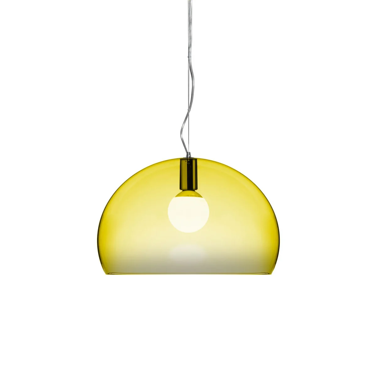 La suspension lumineuse Fly de Kartell est particulièrement bien adaptée pour l'éclairage ciblé des espaces de salon et de repas. Le système de suspension réglable permet d'ajuster la lampe de façon idéale à la hauteur de la table ou du comptoir. L'abat-jour ou la calotte de la suspension Fly n'est pas parfaitement hémisphérique, si bien que la hauteur de coupe se trouve légèrement en dessous de la hauteur du diamètre. La lumière sortante est ainsi mieux regroupée et peut être retransmise de manière ciblée.