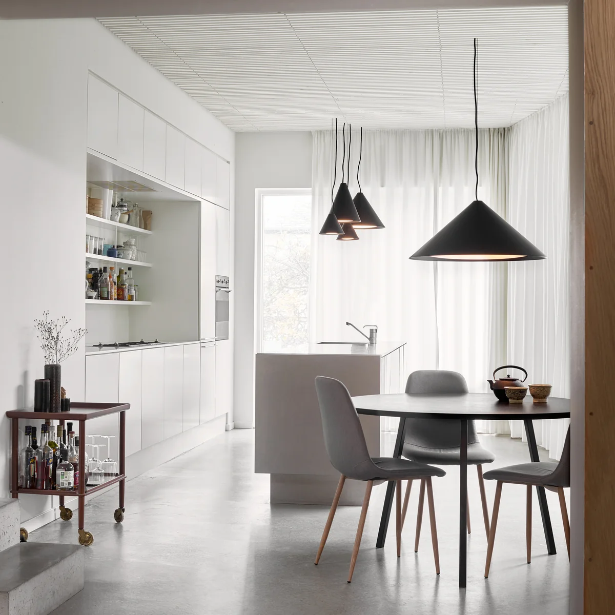 Le luminaire suspendu à LED de Keglen Louis Poulsen convainc par sa teinte conique frappante. Le luminaire est disponible en différentes formes, chaque version d'abat-jour provoquant une diffusion de la lumière complètement différente et l'intérieur réfléchit la lumière vers le bas de manière agréable. Une ouverture régulière et discrète sur le dessus de l'abat-jour diffuse en outre une lumière douce vers le haut, créant ainsi une atmosphère harmonieuse. La lampe a été conçue par Bjarke Ingels et Jakob Lange de Big Ideas.