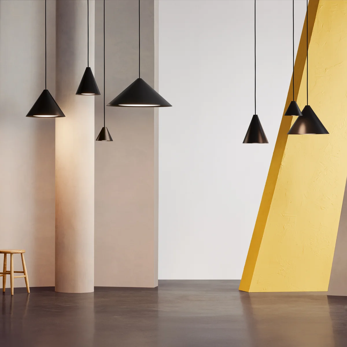 L'objectif de Keglen était de créer une série de luminaires intemporels et fonctionnels qui se fondent aussi bien dans les espaces privés que publics. La qualité de la lumière doit toujours rester la même, quelle que soit la taille du luminaire et la forme du cône. Les nuances géométriques et métalliques ont un insert d'opale douce et organique qui ressemble à une goutte d'eau.