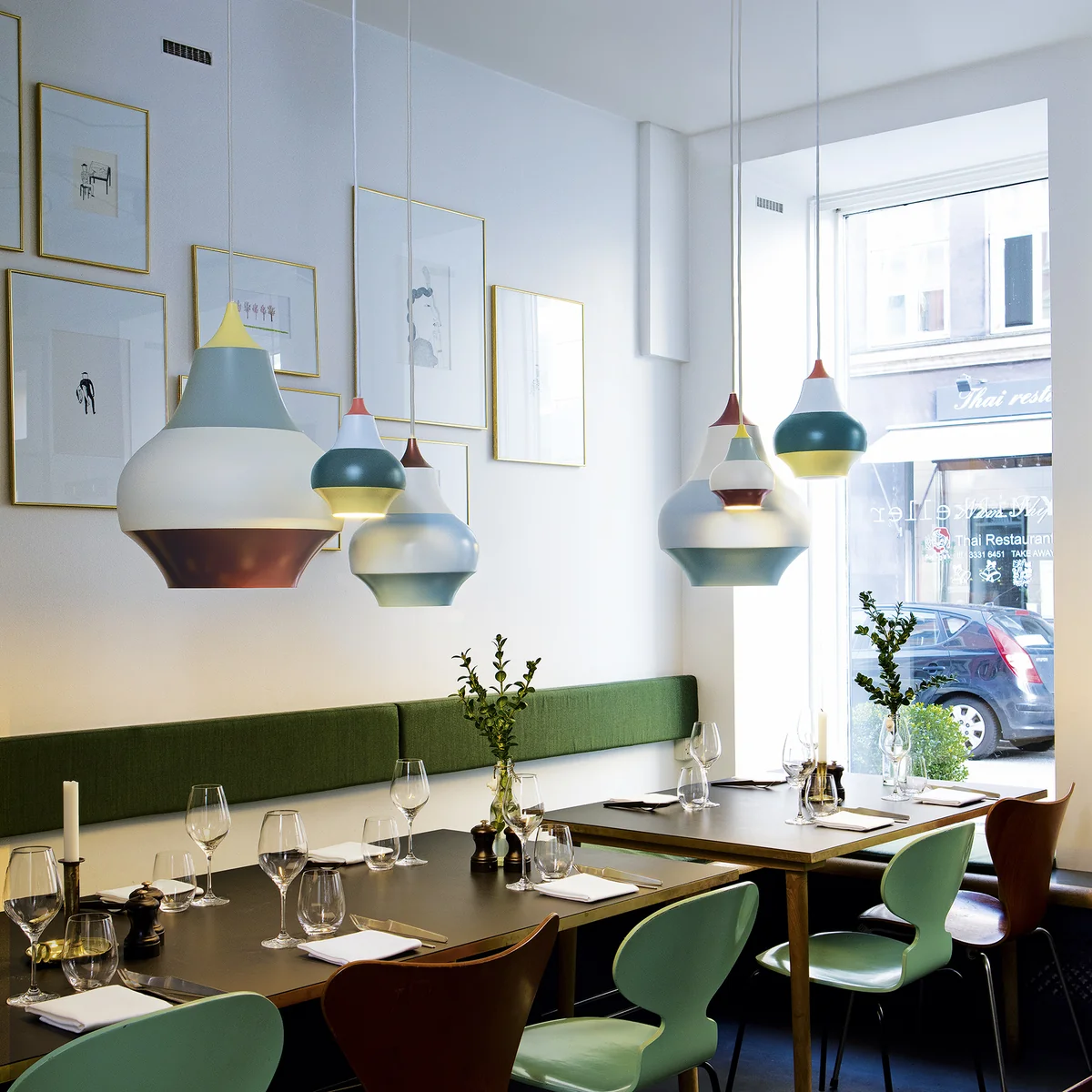 Le luminaire est adaptée pour les restaurants, les cafés et les bars ainsi que pour la cuisine privée ou la salle à manger. Grâce à son intérieur laqué blanc mat, le luminaire projette une douce lumière vers le bas, qui fixé à une hauteur « normale » n’occasionnera aucun éblouissement. Ainsi il est particulièrement bien adapté pour être suspendu assez bas au dessus des tables et comptoirs ou il mettra, selon la version choisie, des accents colorés appropriés. Grâce à sa douille E27, la lampe peut être équipée de différentes sources de lumière, afin que le rendu des couleurs et la température de lumière puissent être déterminées individuellement.