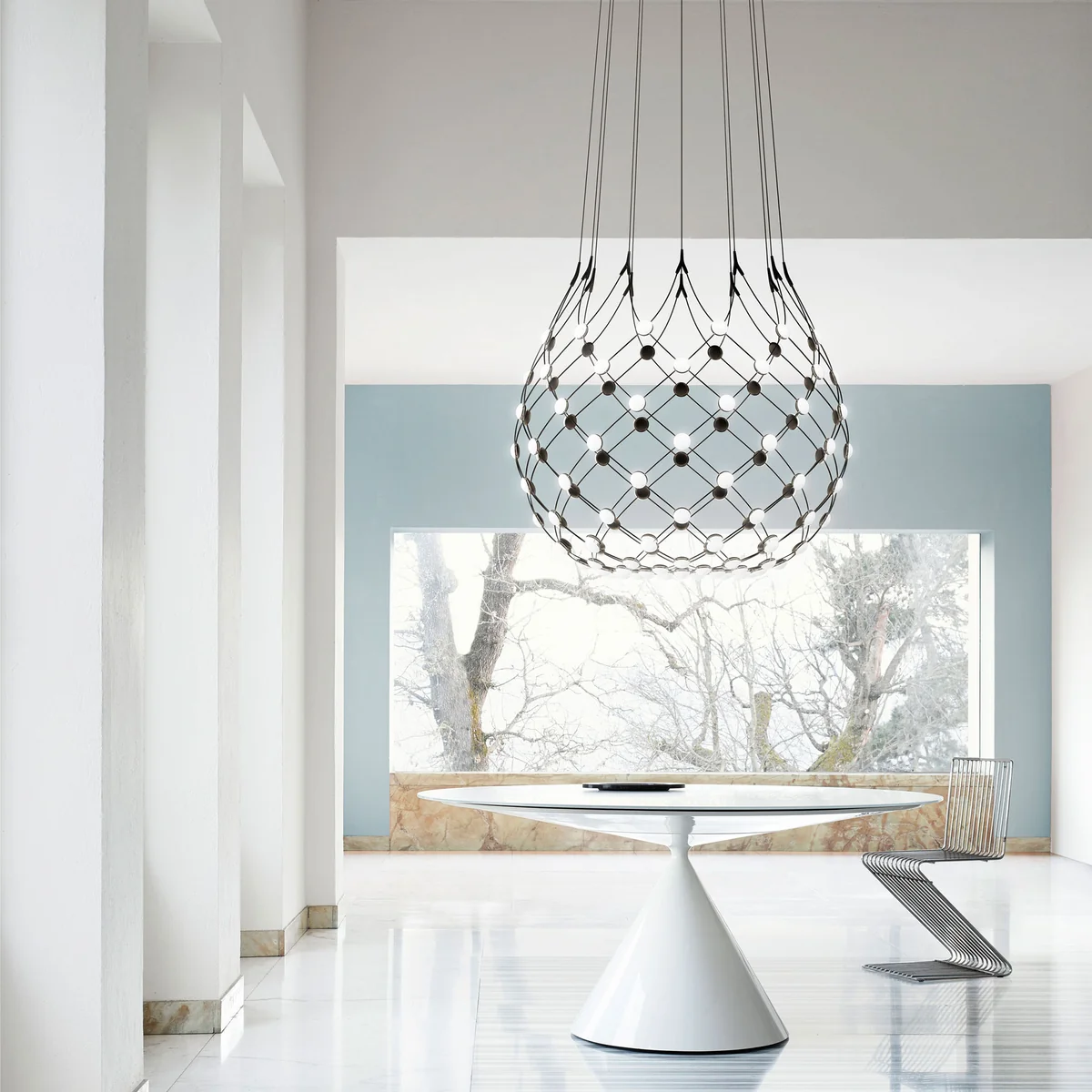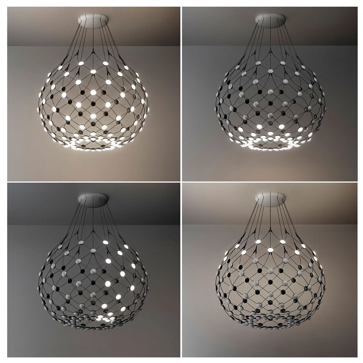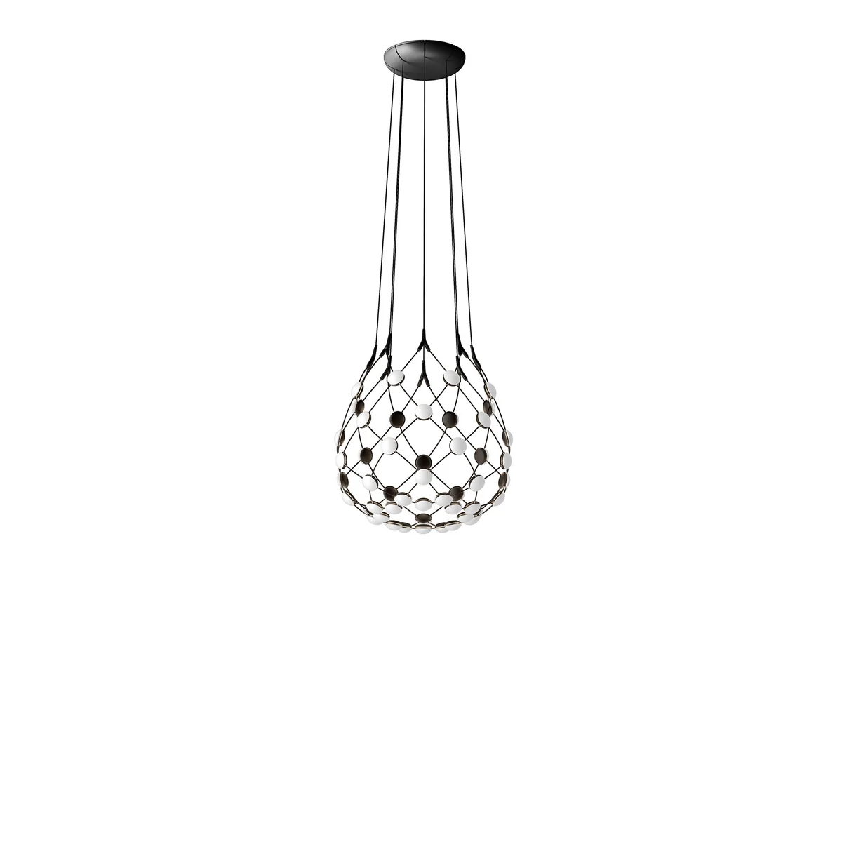 La structure légère et presque transparente du luminaire se compose d'un réseau de câbles métalliques, aux jonctions desquels sont fixées des LEDs. Le design se concentre entièrement sur les sources lumineuses. Une création poétique de grand impact qui permet de créer une atmosphère raffinée et atmosphérique dans l'espace de vie ou l'espace public.