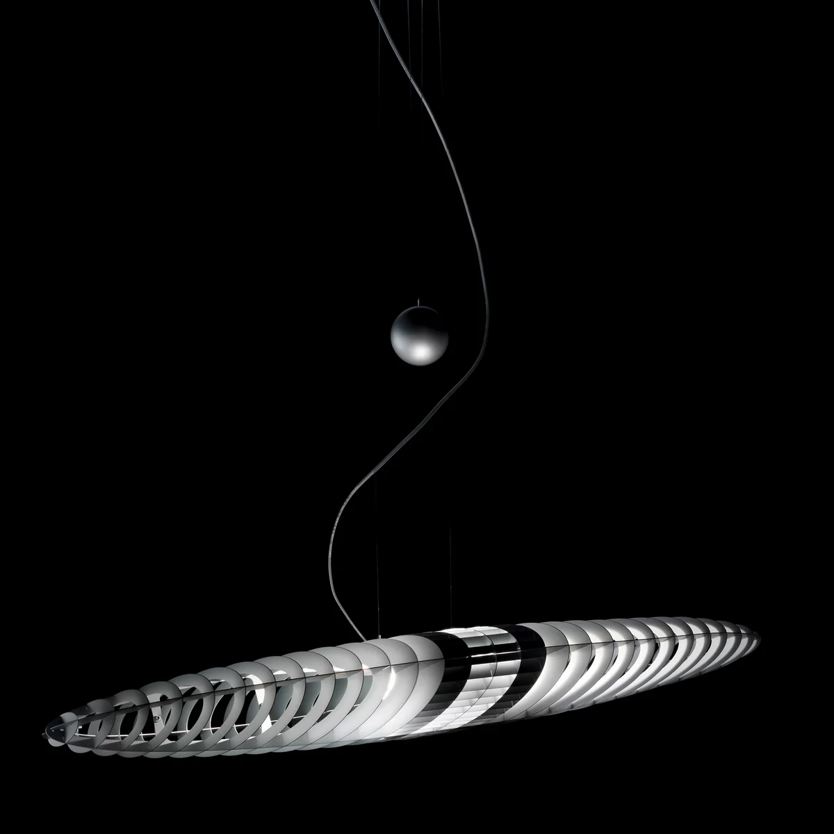 De multiples lamelles forment le corps elliptique de la suspension Titania. Au centre, la source lumineuse dégage sa lumière à travers les lames et rayonne dans l'espace. Une manipulation simple permet d’installer des filtres de couleurs dans le coeur de la lampe et les ailes prennent ainsi la couleur désirée. La couleur centrale de la lampe reste, elle, toujours blanche.