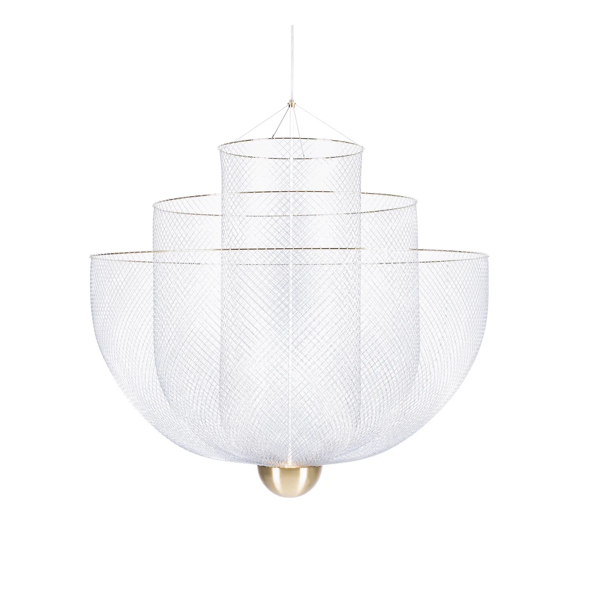 Le lustre Moooi Meshmatics est né sous la plume du designer de produits Rick Tegelaar. Le design élégant du lustre a été réalisé de manière tout à fait artistique. Pour son lustre, le designer néerlandais a mis au point une machine qui permet de façonner le filigrane de métal tissé selon ses propres souhaits. L'abat-jour est composé de trois fines couches de structure en grillage métallique qui projettent la lumière de l'intérieur de ce luminaire sur les murs avec de très beaux motifs et ombres.