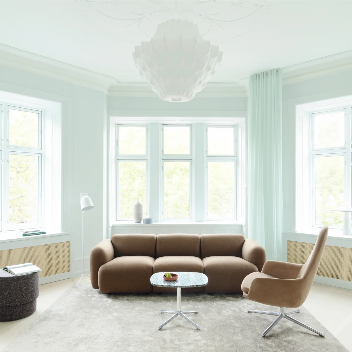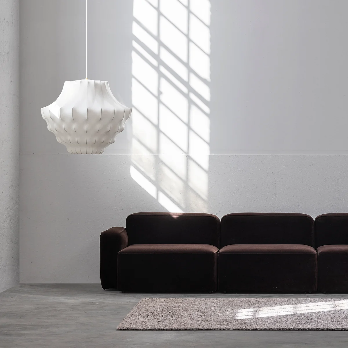 Phantom by Normann Copenhagen est une série de luminaires suspendus volumineux fabriqués dans un matériau spécial en résine semi-transparente. Simon Legald s'est inspiré des lustres classiques pour les lampes, qui prennent une expression douce et iconique dans le voile blanc ivoire.